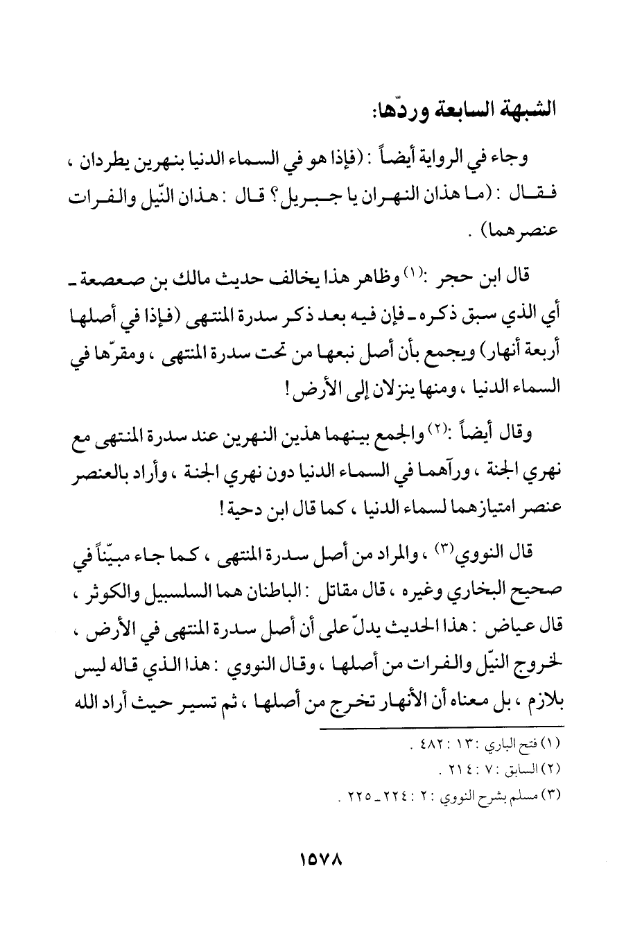 قال ابن حجر: (¬1) وظاهر هذا يخالف حديث مالك بن صعصعة -أي الذي سبق ذكره- فإن فيه بعد ذكر سدرة المنتهى (فإذا في أصلها أربعة أنهار) ويجمع بأن أصل نبعها من تحت سدرة المنتهى، ومقرّها في السماء الدنيا، ومنها ينزلان إلى الأرض!