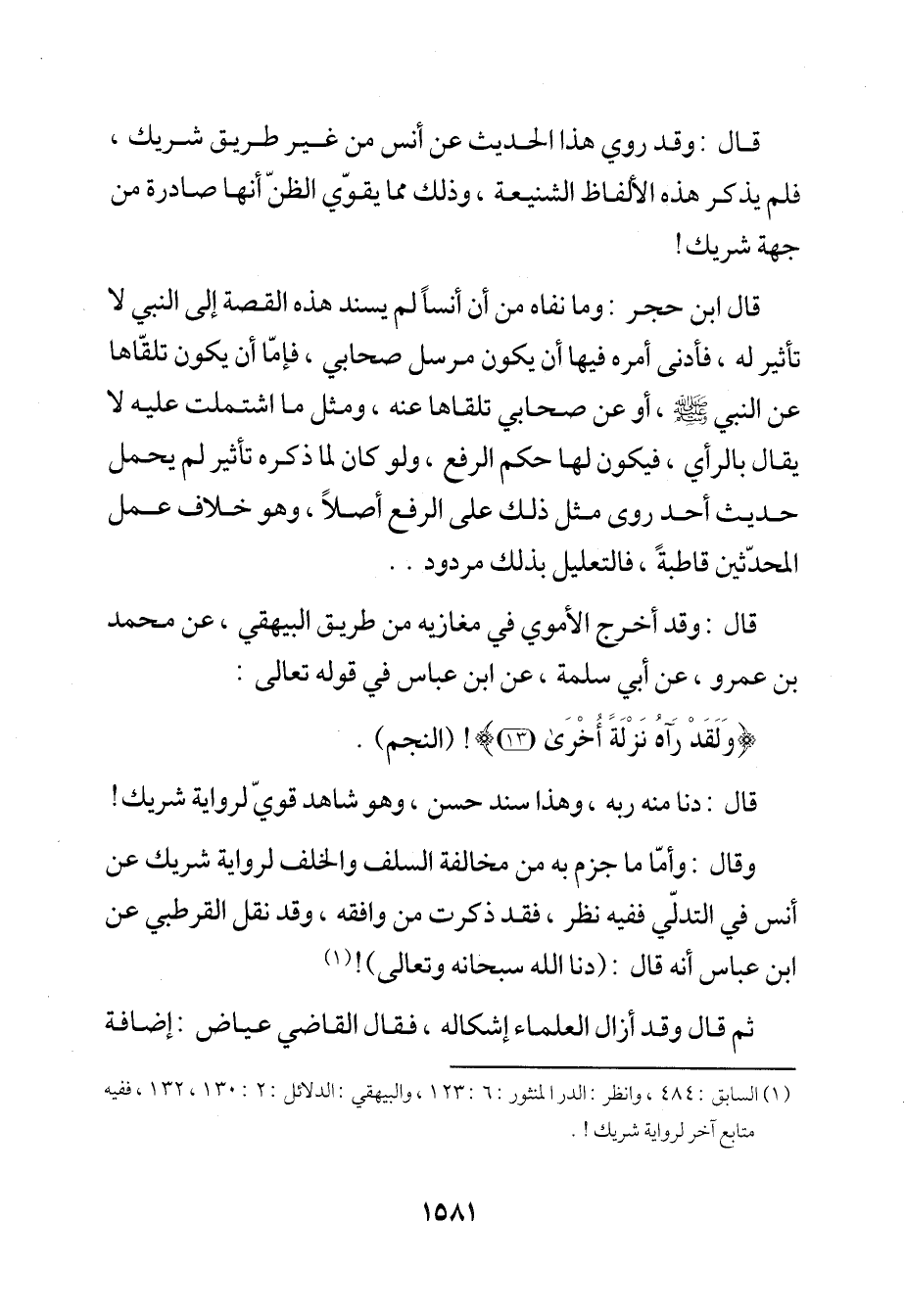 وقال: وأمّا ما جزم به من مخالفة السلف والخلف لرواية شريك عن أنس في التدلّي ففيه نظر، فقد ذكرت من وافقه، وقد نقل القرطبي عن ابن عباس أنه قال: (دنا الله سبحانه وتعالى)! (¬1)