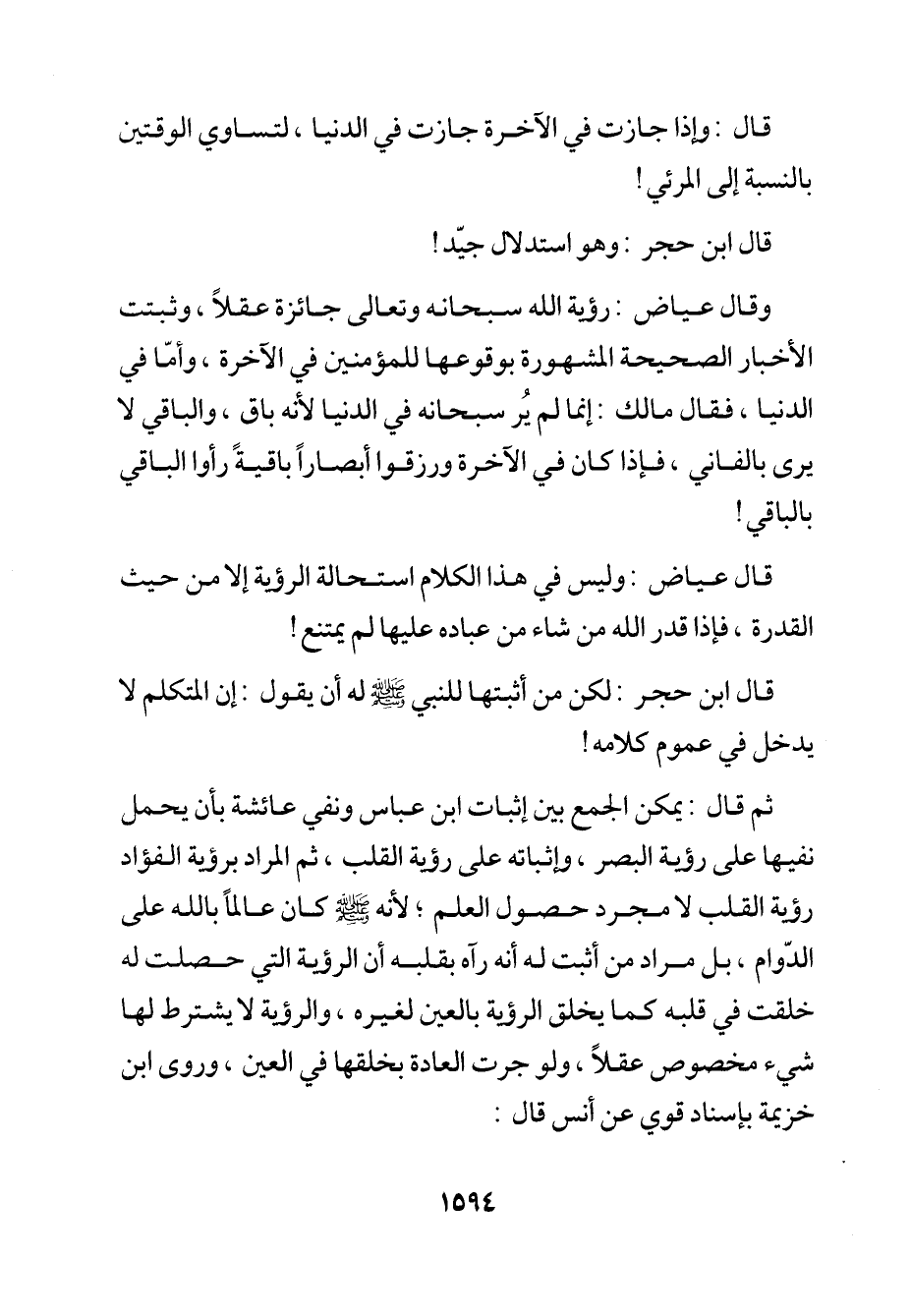 وقال عياض: رؤية الله سبحانه وتعالى جائزة عقلًا، وثبتت الأخبار الصحيحة المشهورة بوقوعها للمؤمنين في الآخرة، وأمّا في الدنيا، فقال مالك: إنما لم يُر سبحانه في الدنيا لأنه باق، والباقي لا يرى بالفاني، فإذا كان في الآخرة ورزقوا أبصارًا باقيةً رأوا الباقي بالباقي!