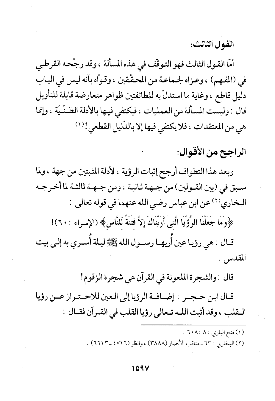وبعد هذا التطواف أرجح إثبات الرؤية، لأدلة المثبتين من جهة، ولما سبق في (بين القولين) من جهة ثانية، ومن جهة ثالثة لما أخرجه البخاري (¬2) عن ابن عباس رضي الله عنهما في قوله تعالى:
