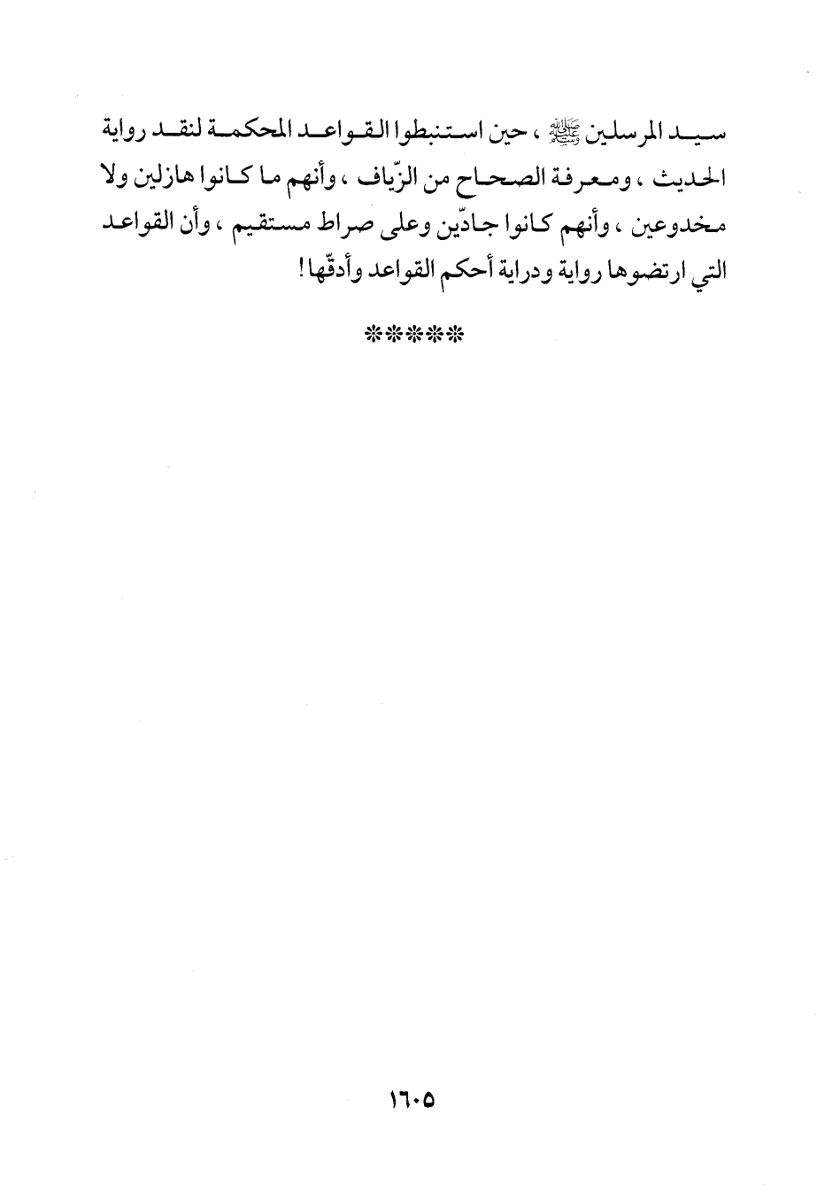 سيد المرسلين - صلى الله عليه وسلم -، حين استنبطوا القواعد المحكمة لنقد رواية الحديث، ومعرفة الصحاح من الزّياف، وأنهم ما كانوا هازلين ولا مخدوعين، وأنهم كانوا جادّين وعلى صراط مستقيم، وأن القواعد التي ارتضوها رواية ودراية أحكم القواعد وأدقّها!