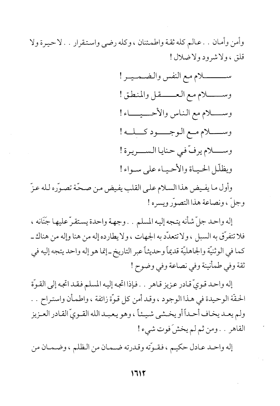 إله واحد جلّ شأنه يتجه إليه المسلم .. وجهة واحدة يستقرّ عليها جَنَانه، فلا تتفرّق به السبل، ولا تتعدّد به الجهات، ولا يطارده إله من هنا وإله من هناك -كما في الوثنيّة والجاهليّة قديمًا وحديثًا عبر التاريخ- إنما هو إله واحد يتجه إليه في ثقة وفي طمأنينة وفي نصاعة وفي وضوح!