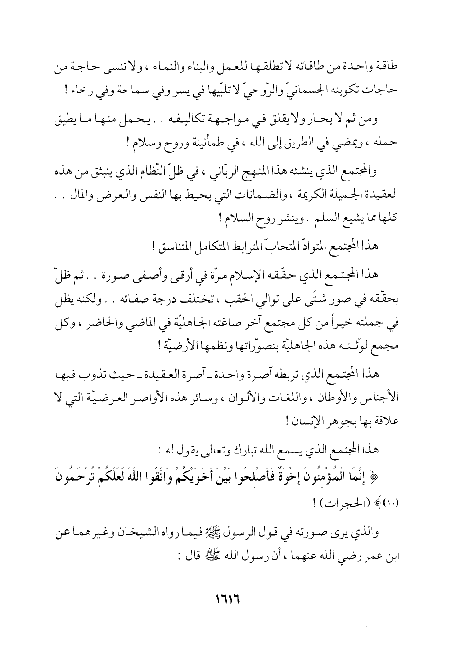 طاقة واحدة من طاقاته لا تطلقها للعمل والبناء والنماء، ولا تنسى حاجة من حاجات تكوينه الجسمانيّ والرّوحيّ لا تلبّيها في يسر وفي سماحة وفي رخاء!
