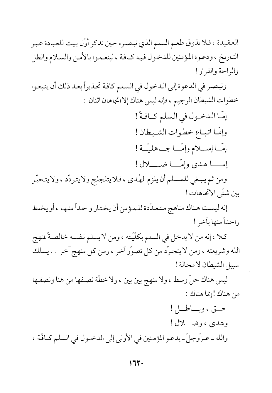 ونبصر في الدعوة إلى الدخول في السلم كافة تحذيرًا بعد ذلك أن يتبعوا خطوات الشيطان الرجيم، فإنه ليس هناك إلا اتجاهان اثنان: