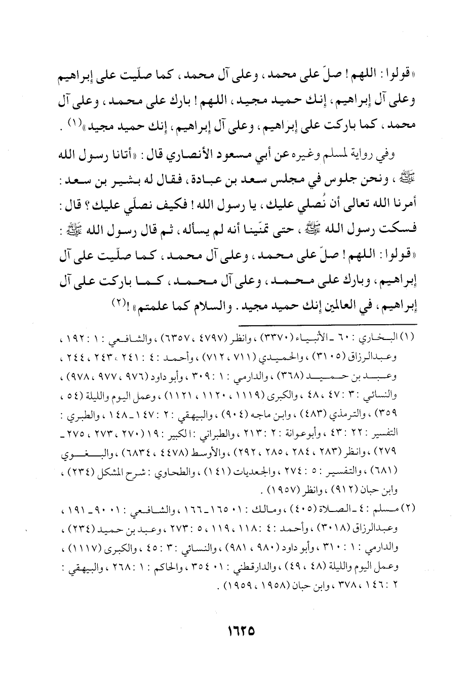 وفي رواية لمسلم وغيره عن أبي مسعود الأنصاري قال: "أتانا رسول الله -صلى الله عليه وسلم-، ونحن جلوس في مجلس سعد بن عبادة، فقال له بشير بن سعد: أمرنا الله تعالى أن نُصلي عليك، يا رسول الله! فكيف نصلّي عليك؟ قال: فسكت رسول الله -صلى الله عليه وسلم-، حتى تمنّينا أنه لم يسأله ثم قال رسول الله -صلى الله عليه وسلم-: "قولوا: اللهم! صلّ على محمَّد، وعلى آل محمَّد، كما صلّيت على آل إِبراهيم، وبارك على محمَّد، وعلى آل محمَّد، كما باركت على آل إِبراهيم، في العالمين إِنك حميد مجيد. والسلام كما علمتم"! (¬2)