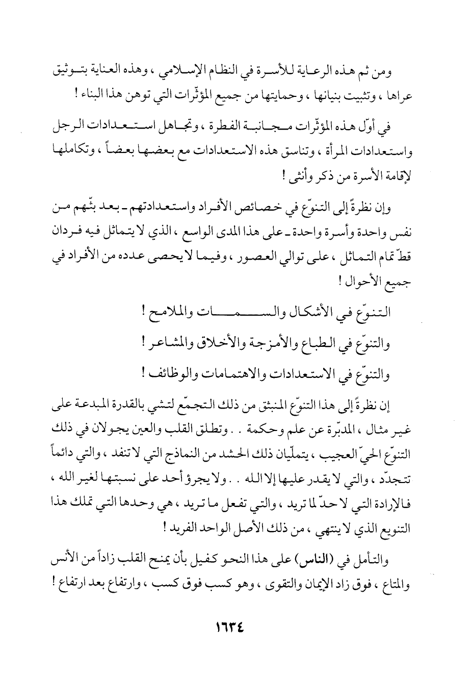 وإن نظرةً إلى التنوّع في خصائص الأفراد واستعدادتهم -بعد بثّهم من نفس واحدة وأسرة واحدة- على هذا المدى الواسع، الذي لا يتماثل فيه فردان قطّ تمام التماثل، على توالي العصور، وفيما لا يحصى عدده من الأفراد في جميع الأحوال!