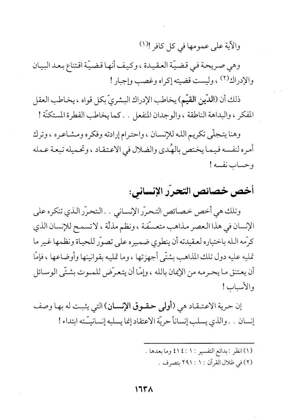 وتلك هي أخص خصائص التحرر الإنساني .. التحرر الذي تنكره على الإنسان في هذا العصر مذاهب متعسّفة، ونظم مذلّة، لا تسمح للإنسان الذي كرّمه الله باختياره لعقيدته أن ينطوي ضميره على تصوّر للحياة ونظمها غير ما تمليه عليه دول تلك المذاهب بشتى أجهزتها، وما تمليه بقوانينها وأوضاعها، فإمّا أن يعتنق ما يحرمه من الإيمان بالله، وإمّا أن يتعرّض للموت بشتّى الوسائل والأسباب!