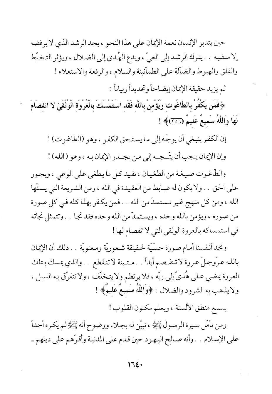 ونجد أنفسنا أمام صورة حسيّة لحقيقة شعوريّة ومعنويّة .. ذلك أن الإيمان بالله عزّ وجلّ عروة لا تنفصم أبدًا .. متينة لا تنقطع .. والذي يمسك بتلك العروة يمضي على هُدىً إلى ربّه، فلا يرتطم ولا يتخلّف، ولا تتفرّق به السبل، ولا يذهب به الشرود والضلال: {وَاللَّهُ سَمِيعٌ عَلِيمٌ}!