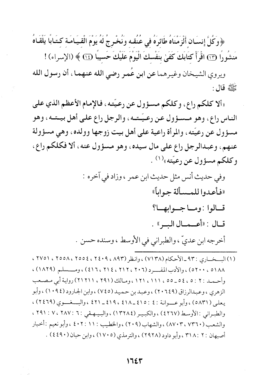 "ألا كلكم راع، وكلكم مسؤول عن رعيّته، فالإِمام الأعظم الذي على الناس راع، وهو مسؤول عن رعيّته، والرجل راع على أهل بيته، وهو مسؤول عن رعيّته، والمرأة راعية على أهل بيت زوجها وولده، وهي مسؤولة عنهم، وعبد الرجل راع على مال سيده، وهو مسؤول عنه، ألا فكلكم راع، وكلكم مسؤول عن رعيّته" (¬1).