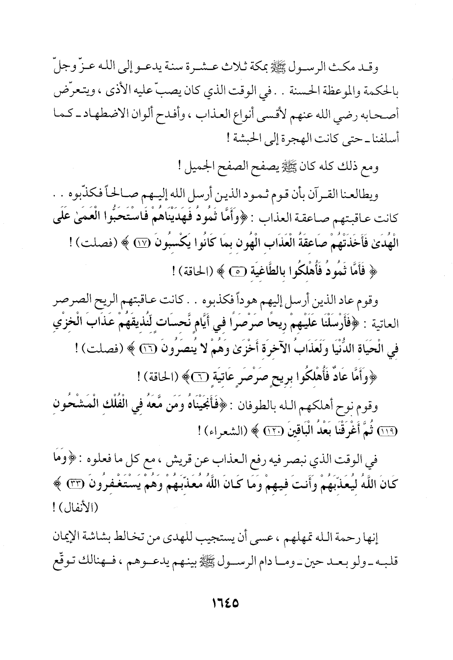 في الوقت الذي نبصر فيه رفع العذاب عن قريش، مع كل ما فعلوه: {وَمَا كَانَ اللَّهُ لِيُعَذِّبَهُمْ وَأَنْتَ فِيهِمْ وَمَا كَانَ اللَّهُ مُعَذِّبَهُمْ وَهُمْ يَسْتَغْفِرُونَ (33)} [الأنفال: 33]!