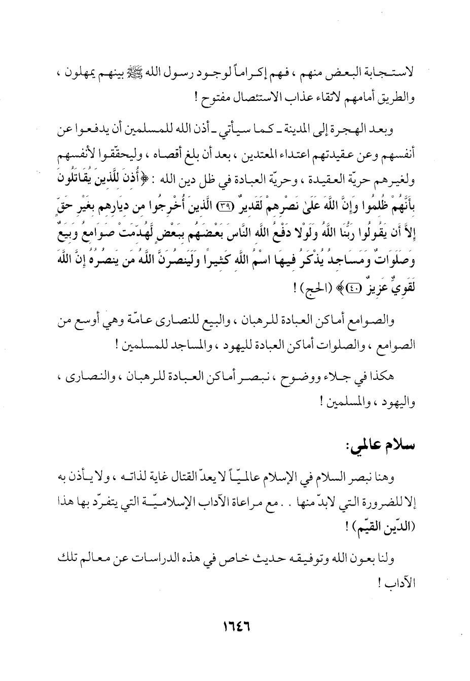 وهنا نبصر السلام في الإِسلام عالميًّا لا يعدّ القتال غاية لذاته، ولا يأذن به إلا للضرورة التي لا بدّ منها .. مع مراعاة الآداب الإِسلاميّة التي يتفرّد بها هذا (الدّين القيّم)!