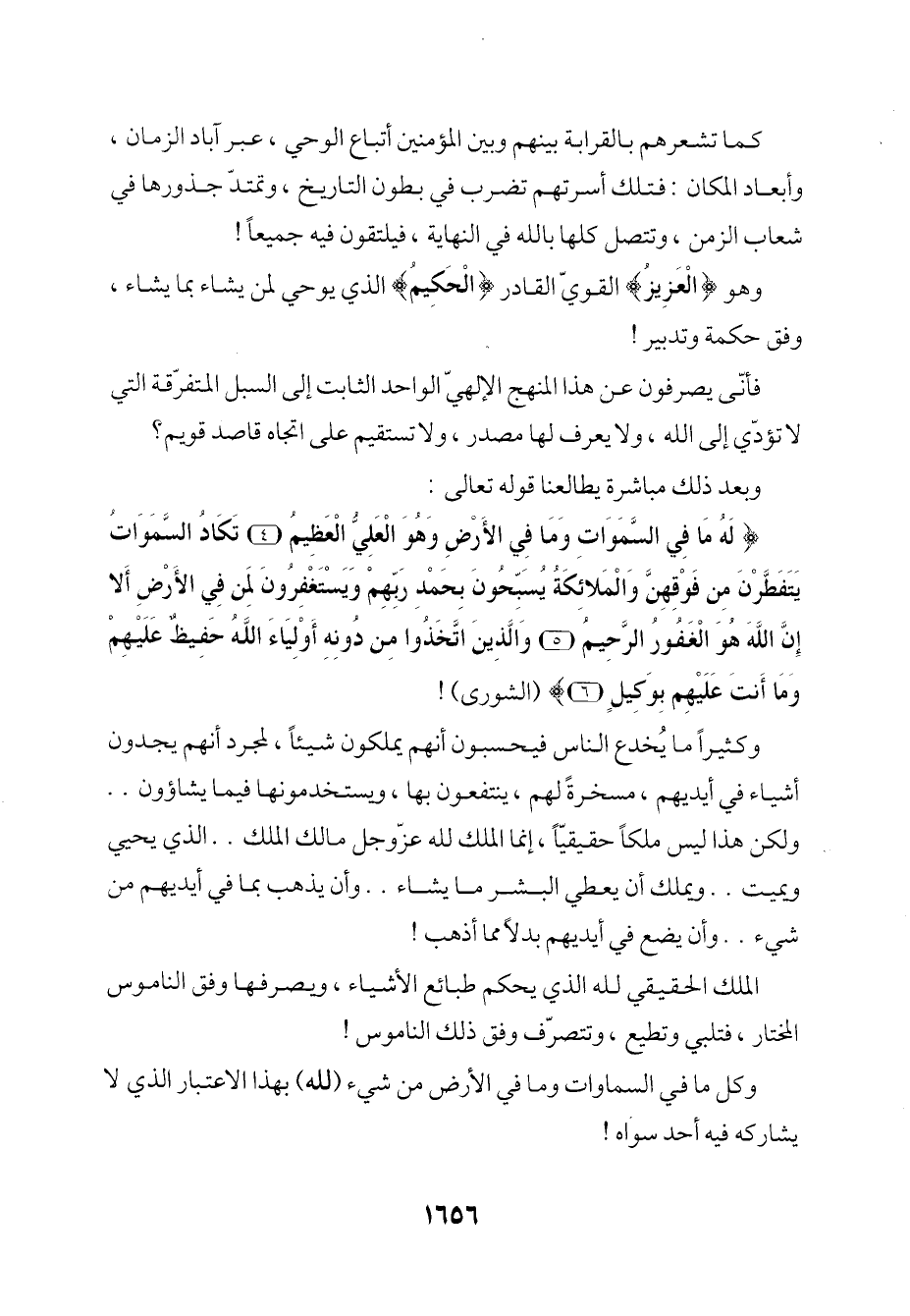 كما تشعرهم بالقرابة بينهم وبين المؤمنين أتباع الوحي، عبر آباد الزمان، وأبعاد المكان: فتلك أسرتهم تضرب في بطون التاريخ، وتمتدّ جذورها في شعاب الزمن، وتتصل كلها بالله في النهاية، فيلتقون فيه جميعاً!
