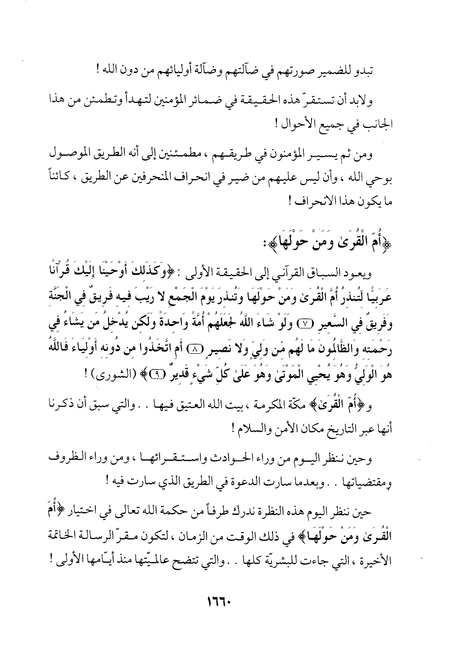 حين ننظر اليوم هذه النظرة ندرك طرفاً من حكمة الله تعالى في اختيار {أُمَّ الْقُرَى وَمَنْ حَوْلَهَا} في ذلك الوقت من الزمان، لتكون مقرّ الرسالة الخاتمة الأخيرة، التي جاءت للبشريّة كلها .. والتي تتصح عالميّتها منذ أيامها الأولى!