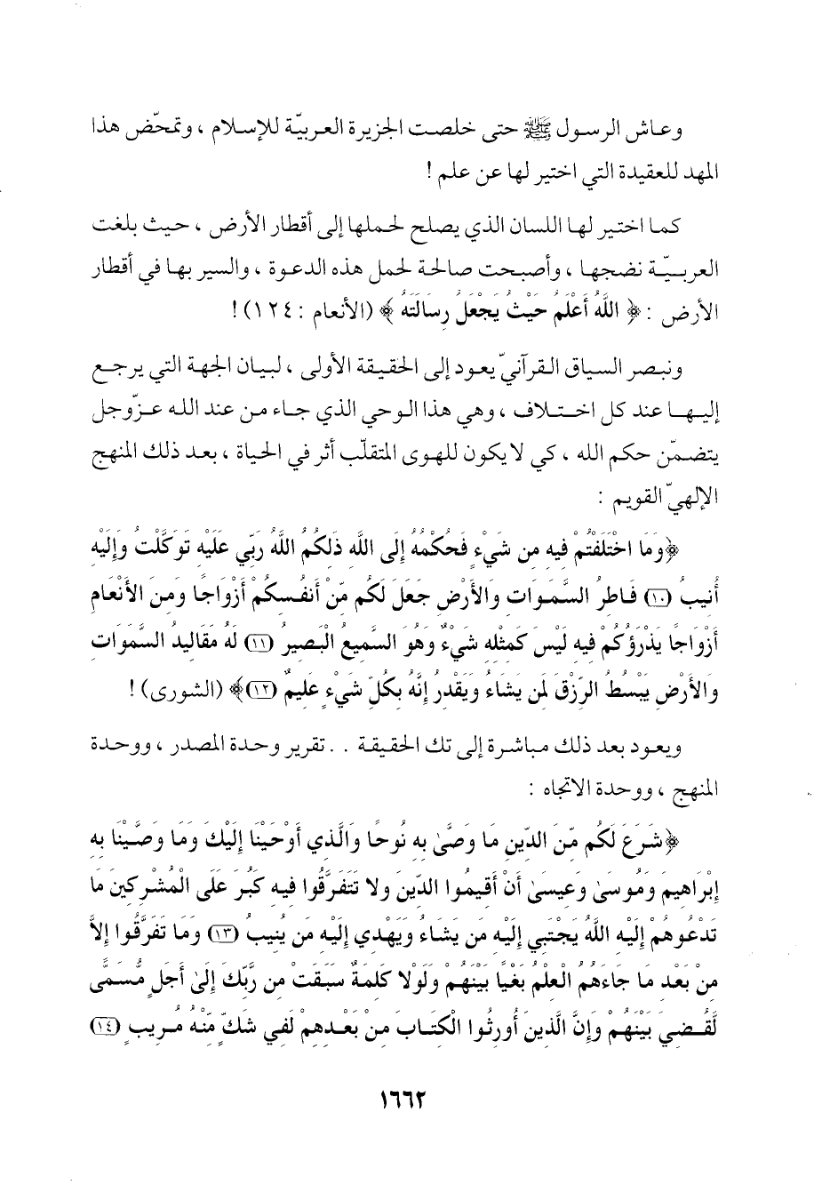 {شَرَعَ لَكُمْ مِنَ الدِّينِ مَا وَصَّى بِهِ نُوحًا وَالَّذِي أَوْحَيْنَا إِلَيْكَ وَمَا وَصَّيْنَا بِهِ إِبْرَاهِيمَ وَمُوسَى وَعِيسَى أَنْ أَقِيمُوا الدِّينَ وَلَا تَتَفَرَّقُوا فِيهِ كَبُرَ عَلَى الْمُشْرِكِينَ مَا تَدْعُوهُمْ إِلَيْهِ اللَّهُ يَجْتَبِي إِلَيْهِ مَنْ يَشَاءُ وَيَهْدِي إِلَيْهِ مَنْ يُنِيبُ (13) وَمَا تَفَرَّقُوا إِلَّا مِنْ بَعْدِ مَا جَاءَهُمُ الْعِلْمُ بَغْيًا بَيْنَهُمْ وَلَوْلَا كَلِمَةٌ سَبَقَتْ مِنْ رَبِّكَ إِلَى أَجَلٍ مُسَمًّى لَقُضِيَ بَيْنَهُمْ وَإِنَّ الَّذِينَ أُورِثُوا الْكِتَابَ مِنْ بَعْدِهِمْ لَفِي شَكٍّ مِنْهُ مُرِيبٍ (14)