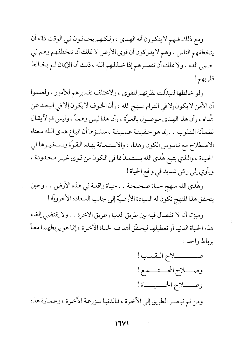 ولو خالطها لتبدّلت نظرتهم للقوى، ولاختلف تقديرهم للأمور، ولعلموا أن الأمن لا يكون إلا في التزام منهج الله، وأن الخوف لا يكون إلا في البعد عن هُداه، وأن هذا الهدى موصول بالعزّة، وأن هذا ليس وهماً، وليس قولًا يقال لطمأنة القلوب .. إنما هو حقيقة عميقة، منشؤها أن اتباع هدى الله معناه الاصطلاح مع ناموس الكون وهداه، والاستعانة بهذه القوّة وتسخيرها في الحياة، والذي يتبع هُدى الله يستمدّ مما في الكون من قوى غير محدودة، ويأوي إلى ركن شديد في واقع الحياة!