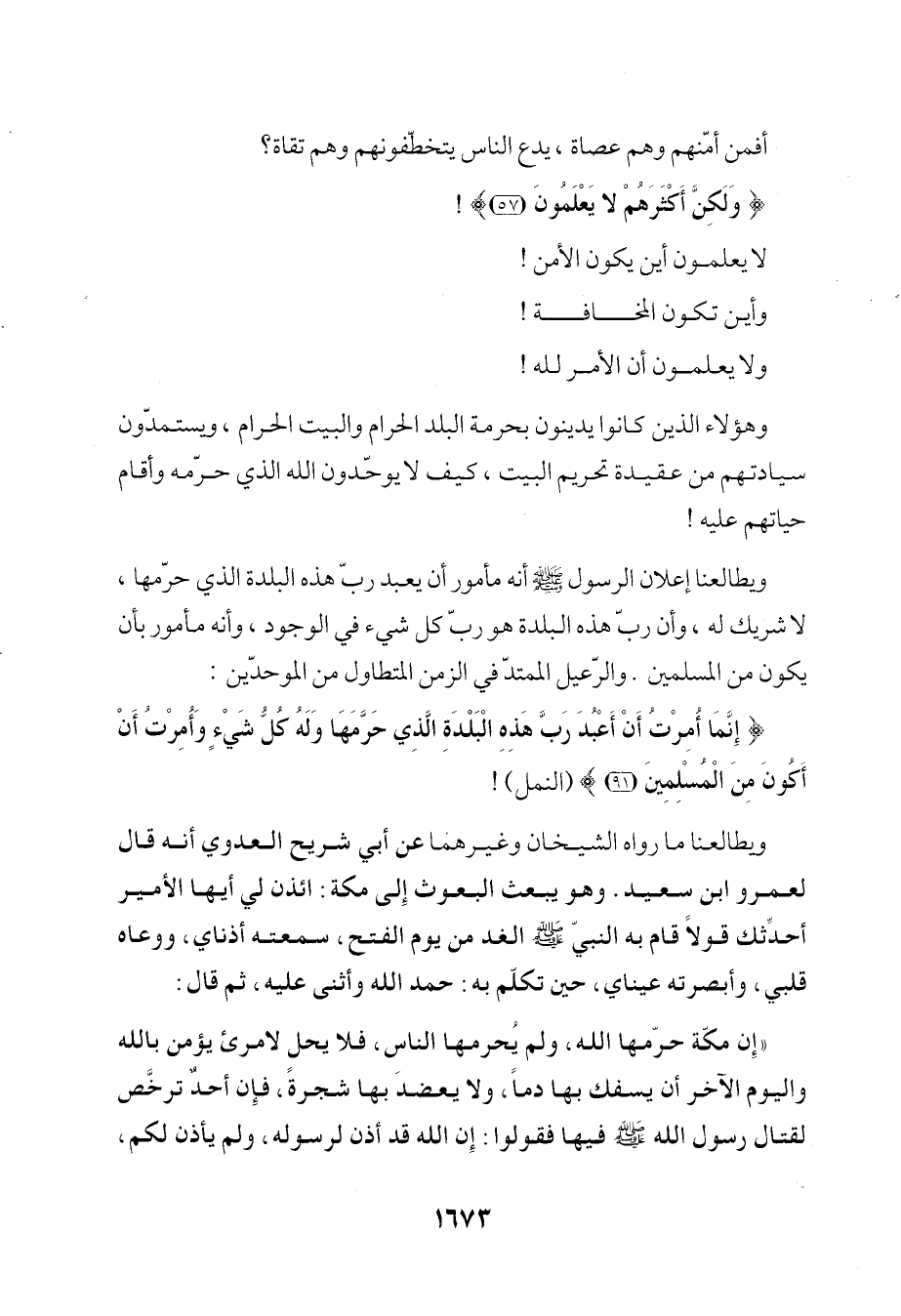 "إِن مكّة حرّمها الله، ولم يُحرمها الناس، فلا يحل لامرئ يؤمن بالله واليوم الآخر أن يسفك بها دماً، ولا يعضدَ بها شجرةً، فإِن أحد ترخَّص لقتال رسول الله - صلى الله عليه وسلم - فيها فقولوا: إِن الله قد أذن لرسوله، ولم يأذن لكم،