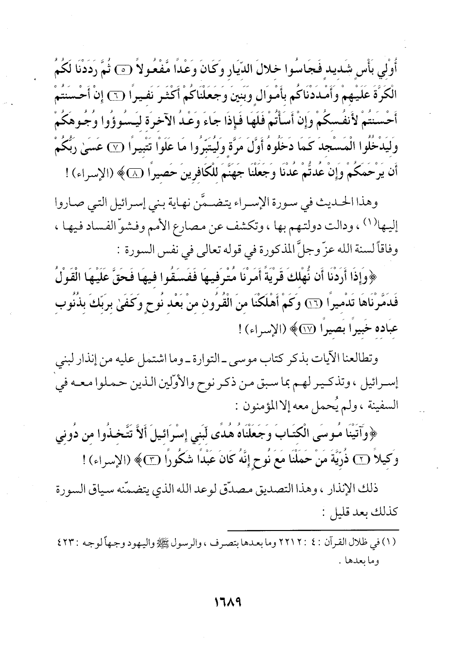 وهذا الحديث في سورة الإسراء يتضمَّن نهاية بني إسرائيل التي صاروا إليها (¬1)؛ ودالت دولتهم بها، وتكشف عن مصارع الأمم وفشوّ الفساد فيها، وفاقاً لسنة الله عَزَّ وَجَلَّ المذكورة في قوله تعالى في نفس السورة: