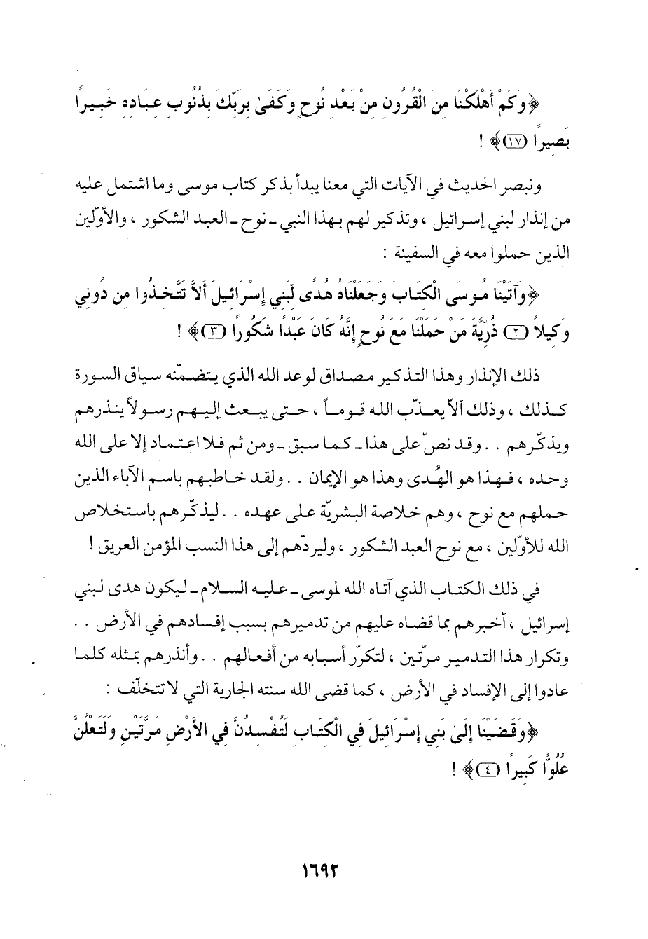 ونبصر الحديث في الآيات التي معنا يبدأ بذكر كتاب موسى وما اشتمل عليه من إنذار لبني إسرائيل، وتذكير لهم بهذا النبي -نوح- العبد الشكور، والأوّلين الذين حملوا معه في السفينة: