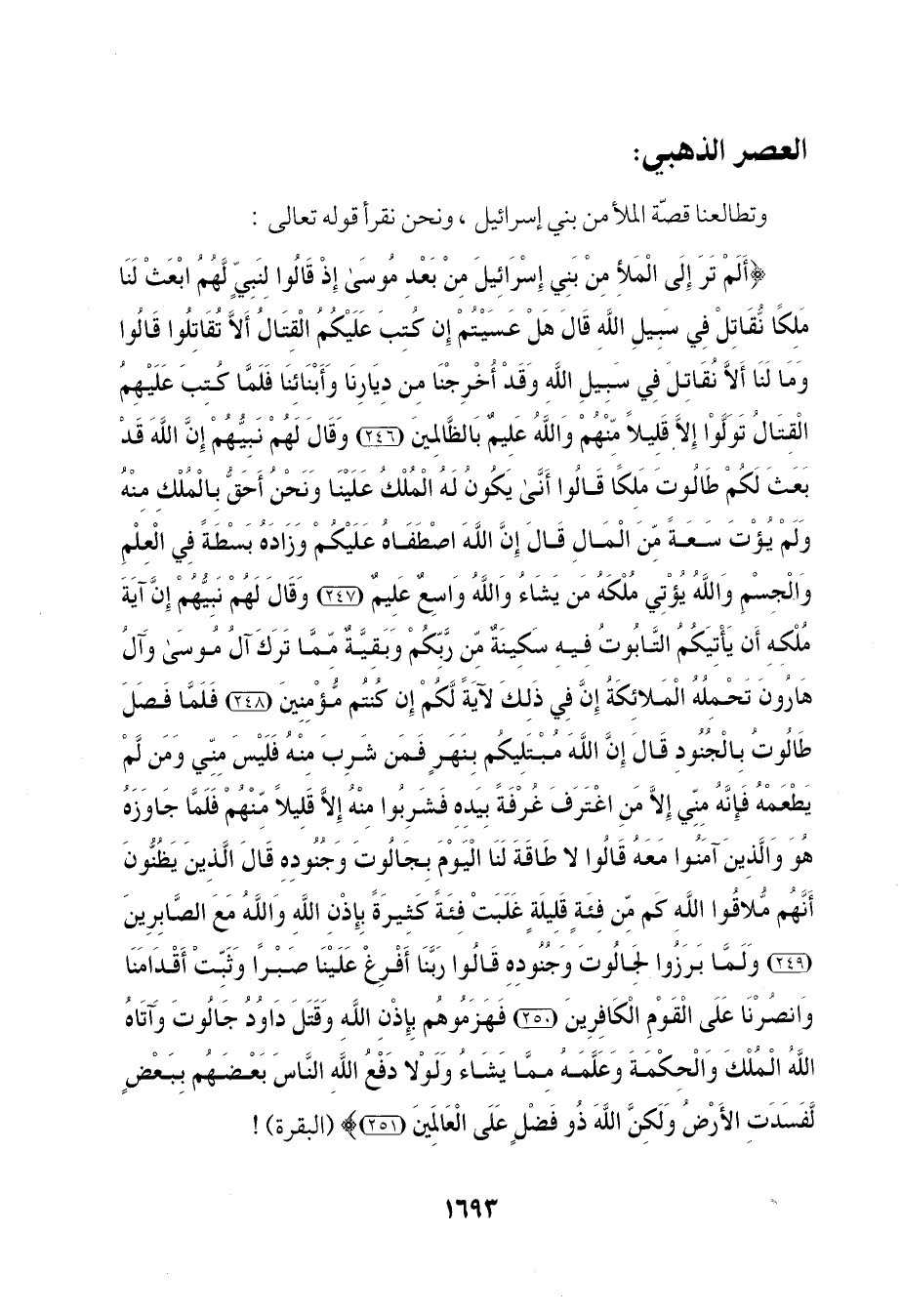 {أَلَمْ تَرَ إِلَى الْمَلَإِ مِنْ بَنِي إِسْرَائِيلَ مِنْ بَعْدِ مُوسَى إِذْ قَالُوا لِنَبِيٍّ لَهُمُ ابْعَثْ لَنَا مَلِكًا نُقَاتِلْ فِي سَبِيلِ اللَّهِ قَالَ هَلْ عَسَيْتُمْ إِنْ كُتِبَ عَلَيْكُمُ الْقِتَالُ أَلَّا تُقَاتِلُوا قَالُوا وَمَا لَنَا أَلَّا نُقَاتِلَ فِي سَبِيلِ اللَّهِ وَقَدْ أُخْرِجْنَا مِنْ دِيَارِنَا وَأَبْنَائِنَا فَلَمَّا كُتِبَ عَلَيْهِمُ الْقِتَالُ تَوَلَّوْا إِلَّا قَلِيلًا مِنْهُمْ وَاللَّهُ عَلِيمٌ بِالظَّالِمِينَ (246) وَقَالَ لَهُمْ نَبِيُّهُمْ إِنَّ اللَّهَ قَدْ بَعَثَ لَكُمْ طَالُوتَ مَلِكًا قَالُوا أَنَّى يَكُونُ لَهُ الْمُلْكُ عَلَيْنَا وَنَحْنُ أَحَقُّ بِالْمُلْكِ مِنْهُ وَلَمْ يُؤْتَ سَعَةً مِنَ الْمَالِ قَالَ إِنَّ اللَّهَ اصْطَفَاهُ عَلَيْكُمْ وَزَادَهُ بَسْطَةً فِي الْعِلْمِ وَالْجِسْمِ وَاللَّهُ يُؤْتِي مُلْكَهُ مَنْ يَشَاءُ وَاللَّهُ وَاسِعٌ عَلِيمٌ (247) وَقَالَ لَهُمْ نَبِيُّهُمْ إِنَّ آيَةَ مُلْكِهِ أَنْ يَأْتِيَكُمُ التَّابُوتُ فِيهِ سَكِينَةٌ مِنْ رَبِّكُمْ وَبَقِيَّةٌ مِمَّا تَرَكَ آلُ مُوسَى وَآلُ هَارُونَ تَحْمِلُهُ الْمَلَائِكَةُ إِنَّ فِي ذَلِكَ لَآيَةً لَكُمْ إِنْ كُنْتُمْ مُؤْمِنِينَ (248) فَلَمَّا فَصَلَ طَالُوتُ بِالْجُنُودِ قَالَ إِنَّ اللَّهَ مُبْتَلِيكُمْ بِنَهَرٍ فَمَنْ شَرِبَ مِنْهُ فَلَيْسَ مِنِّي وَمَنْ لَمْ يَطْعَمْهُ فَإِنَّهُ مِنِّي إِلَّا مَنِ اغْتَرَفَ غُرْفَةً بِيَدِهِ فَشَرِبُوا مِنْهُ إِلَّا قَلِيلًا مِنْهُمْ فَلَمَّا جَاوَزَهُ هُوَ وَالَّذِينَ آمَنُوا مَعَهُ قَالُوا لَا طَاقَةَ لَنَا الْيَوْمَ بِجَالُوتَ وَجُنُودِهِ قَالَ الَّذِينَ يَظُنُّونَ أَنَّهُمْ مُلَاقُو اللَّهِ كَمْ مِنْ فِئَةٍ قَلِيلَةٍ غَلَبَتْ فِئَةً كَثِيرَةً بِإِذْنِ اللَّهِ وَاللَّهُ مَعَ الصَّابِرِينَ (249) وَلَمَّا بَرَزُوا لِجَالُوتَ وَجُنُودِهِ قَالُوا رَبَّنَا أَفْرِغْ عَلَيْنَا صَبْرًا وَثَبِّتْ أَقْدَامَنَا وَانْصُرْنَا عَلَى الْقَوْمِ الْكَافِرِينَ (250) فَهَزَمُوهُمْ بِإِذْنِ اللَّهِ وَقَتَلَ دَاوُودُ جَالُوتَ وَآتَاهُ اللَّهُ الْمُلْكَ وَالْحِكْمَةَ وَعَلَّمَهُ مِمَّا يَشَاءُ وَلَوْلَا دَفْعُ اللَّهِ النَّاسَ بَعْضَهُمْ بِبَعْضٍ لَفَسَدَتِ الْأَرْضُ وَلَكِنَّ اللَّهَ ذُو فَضْلٍ عَلَى الْعَالَمِينَ (251)} (البقرة)!