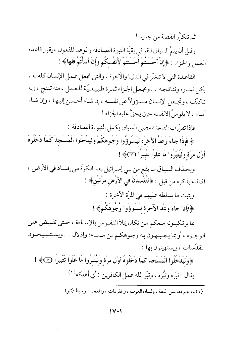 وقبل أن يتمَّ السياق القرآني بقيّة النبوة الصادقة والوعد المفعول، يقرر قاعدة العمل، والجزاء: {إِنْ أَحْسَنْتُمْ أَحْسَنْتُمْ لِأَنْفُسِكُمْ وَإِنْ أَسَأْتُمْ فَلَهَا}!