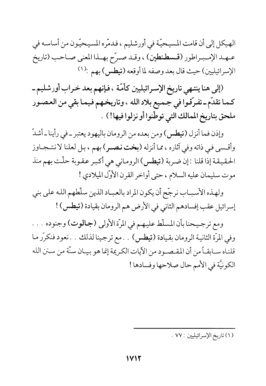 (إلى هنا ينتهي تاريخ الإسرائيليين كأمّة، فإنهم بعد خراب أورشليم -كما تقدّم- تفرّقوا في جميع بلاد الله، وتاريخهم فيما بقي من العصور ملحق بتاريخ الممالك التي توطّنوا أو نزلوا فيها!).