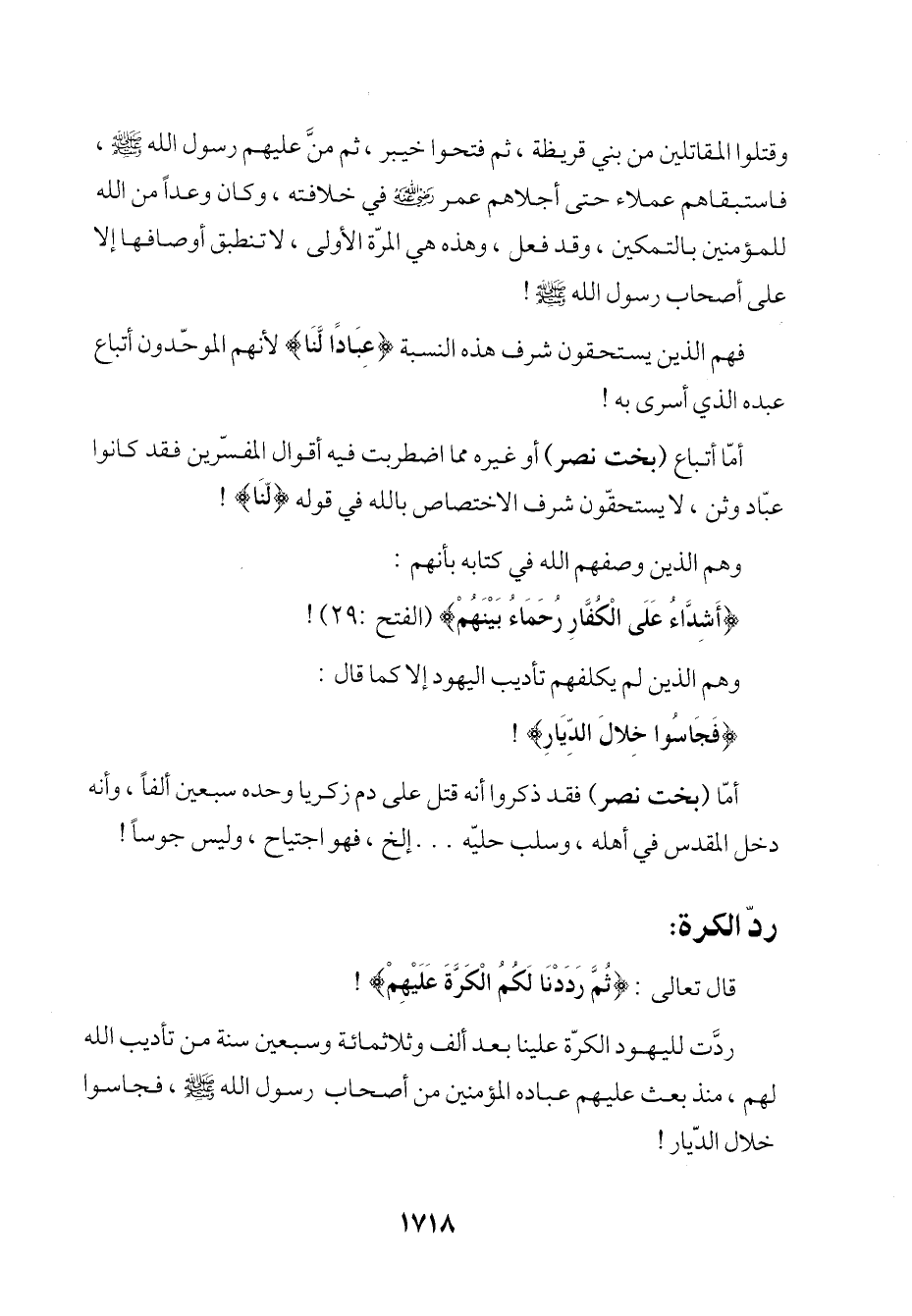 ردَّت لليهود الكرّة علينا بعد ألف وثلاثمائة وسبعين سنة من تأديب الله لهم، منذ بعث عليهم عباده المؤمنين من أصحاب رسول الله - صلى الله عليه وسلم -، فجاسوا خلال الدّيار!