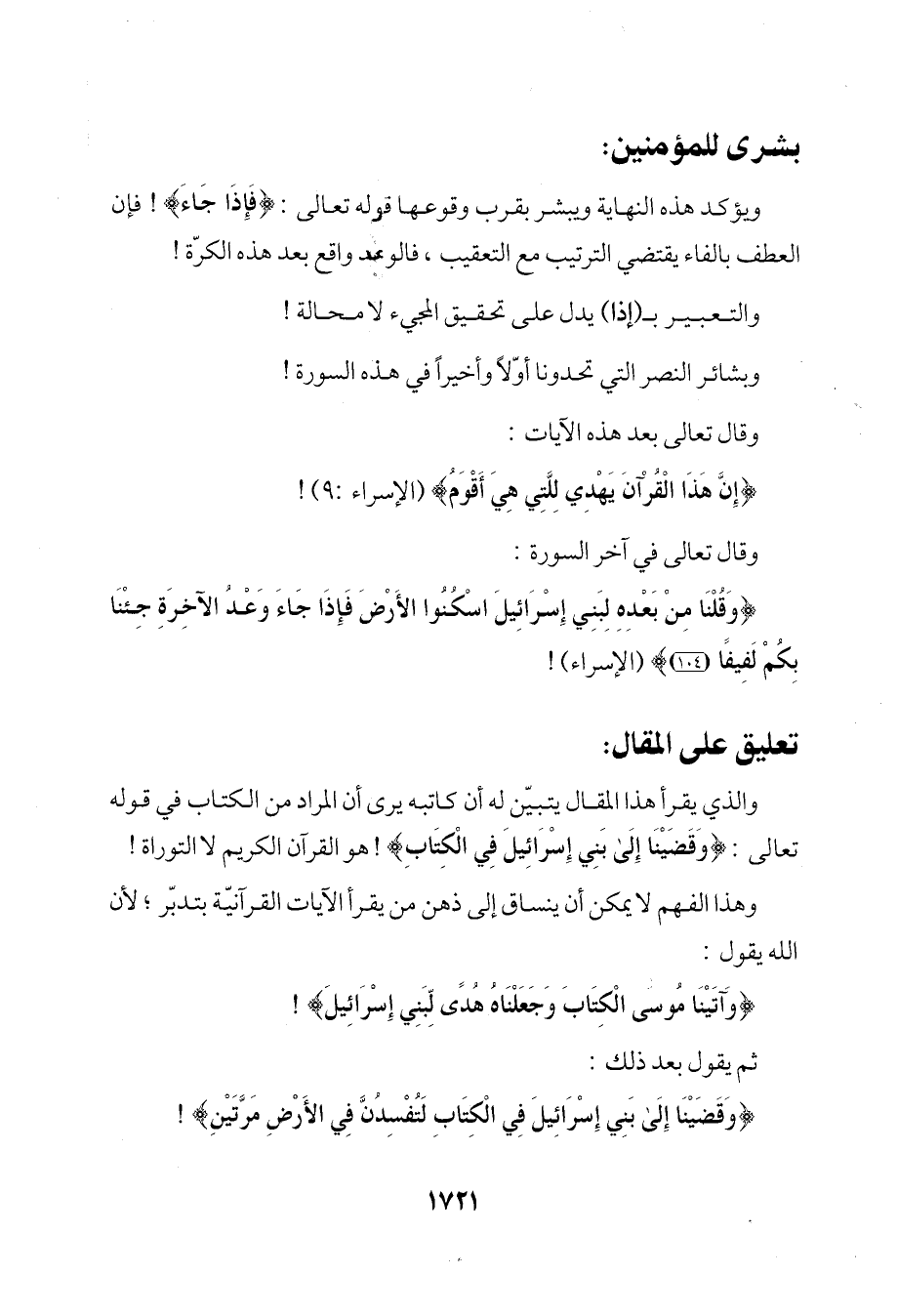 والذي يقرأ هذا المقال يتبيّن له أن كاتبه يرى أن المراد من الكتاب في قوله تعالى: {وَقَضَيْنَا إِلَى بَنِي إِسْرَائِيلَ في الْكِتَابِ}! هو القرآن الكريم لا التوراة!