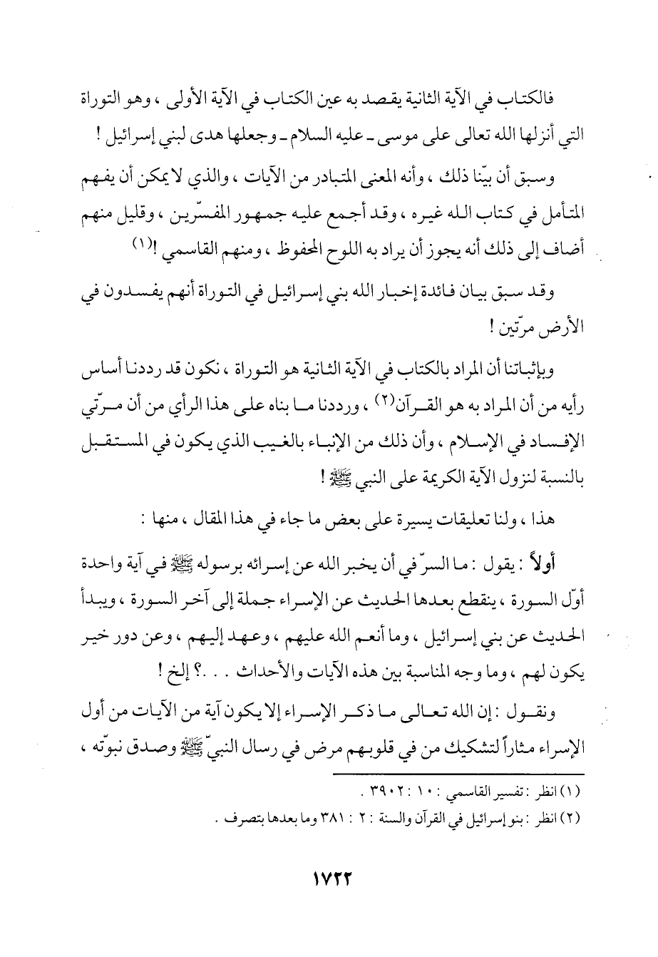 وبإثباتنا أن المراد بالكتاب في الآية الثانية هو التوراة، نكون قد رددنا أساس رأيه من أن المراد به هو القرآن (¬2)، ورددنا ما بناه على هذا الرأي من أن مرّتي الإفساد في الإِسلام، وأن ذلك من الإنباء بالغيب الذي يكون في المستقبل بالنسبة لنزول الآية الكريمة على النبي - صلى الله عليه وسلم -!