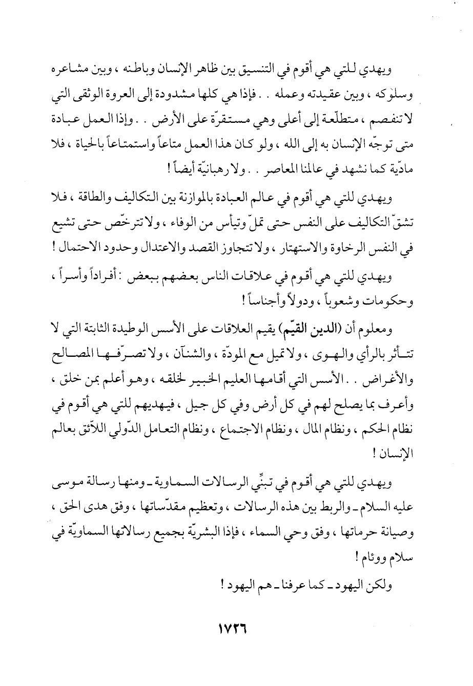 ومعلوم أن (الدين القيّم) يقيم العلاقات على الأسس الوطيدة الثابتة التي لا تتأثر بالرأي والهوى، ولا تميل مع المودة، والشنآن، ولا تصرّفها المصالح والأغراض .. الأسس التي أقامها العلم الخبير لخلقه، وهو أعلم بمن خلق، وأعرف بما يصلح لهم في كل أرض وفي كل جيل، فيهديهم للتي هي أقوم في نظام الحكم، ونظام المال، ونظام الاجتماع، ونظام التعامل الدّولي اللاّئق بعالم الإنسان!