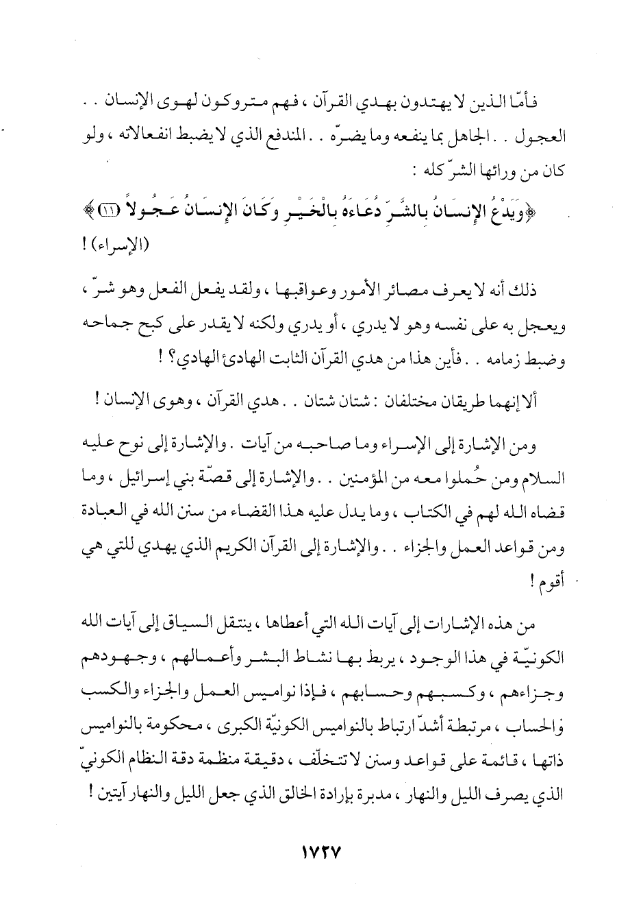 ذلك أنه لا يعرف مصائر الأمور وعواقبها، ولقد يفعل الفعل وهو شرّ، ويعجل به على نفسه وهو لا يدري، أو يدري ولكنه لا يقدر على كبح جماحه وضبط زمامه .. فأين هذا من هدي القرآن الثابت الهادئ الهادي؟!