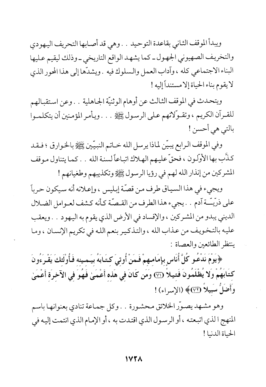 وفي الموقف الرابع يبيّن لماذا يرسل الله خاتم النبيّين - صلى الله عليه وسلم - بالخوارق؛ فقد كذَّب بها الأوّلون، فحقّ عليهم الهلاك اتباعاً لسنة الله .. كما يتناول موقف المشركين من إنذار الله لهم في رؤيا الرسول - صلى الله عليه وسلم - وتكذيبهم وطغيانهم!