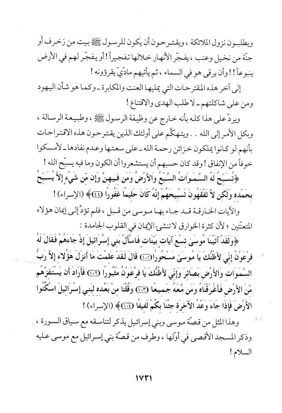 ويردّ على هذا كله بأنه خارج عن وظيفة الرسول - صلى الله عليه وسلم -، وطبيعة الرسالة، وبكل الأمر إلى الله .. ويتهكَّم على أولئك الذين يقترحون هذه الاقتراحات بأنهم لو كانوا يملكون خزائن رحمة الله -على سعتها وعدم نفادها- لأمسكوا خوفاً من الإنفاق! وقد كان حسبهم أن يستشعروا أن الكون وما فيه يسبّح الله!
