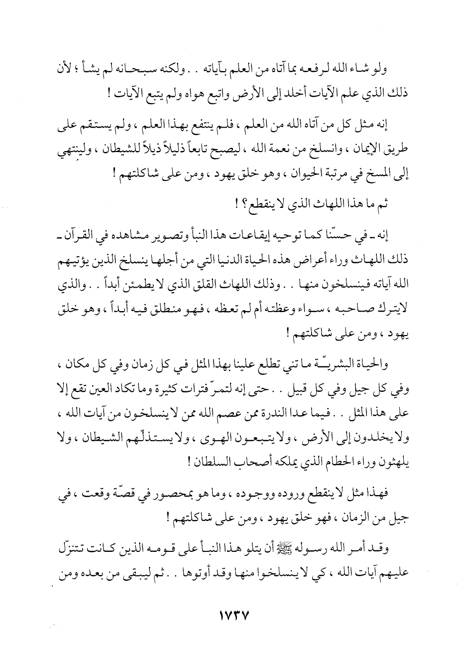 والحياة البشريّة ما تني تطلع علينا بهذا الله في كل زمان وفي كل مكان، وفي كل جيل وفي كل قبيل .. حتى إنه لتمرّ فترات كثيرة وما تكاد العين تقع إلا على هذا المثل .. فيما عدا الندرة ممن عصم الله ممن لا ينسلخون من آيات الله، ولا يخلدون إلى الأرض، ولا يتبعون الهوى، ولا يستذلهّم الشيطان، ولا يلهثون وراء الحطام الذي يملكه أصحاب السلطان!