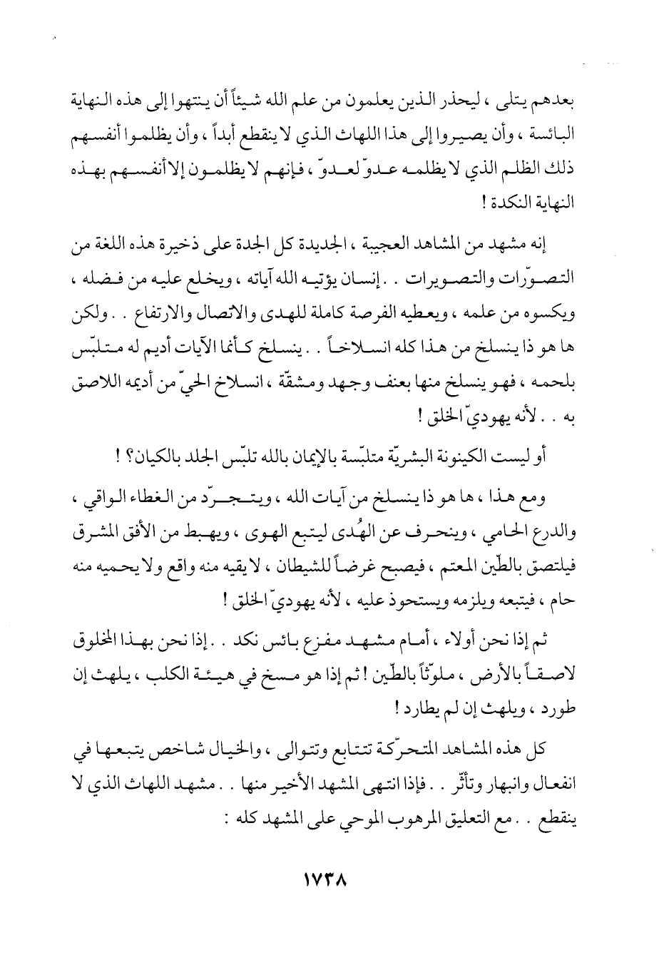 إنه مشهد من المشاهد العجيبة، الجديدة كل الجدة على ذخيرة هذه اللغة من التصوّرات والتصويرات .. إنسان يؤتيه الله آياته، ويخلع عليه من فضله، ويكسوه من علمه، ويعطيه الفرصة كاملة للهدى والاتصال والارتفاع .. ولكن ها هو ذا ينسلخ من هذا كله انسلاخاً .. ينسلخ كأنما الآيات أديم له متلتس بلحمه، فهو ينسلخ منها بعنف وجهد ومشقّة، انسلاخ الحيّ من أديمه اللاصق به .. لأنه يهوديّ الخلق!