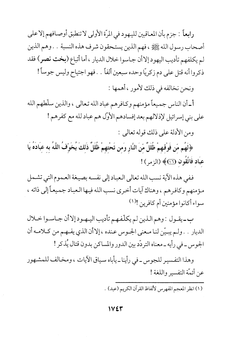 ب- يقول: وهم الذين لم يكلّفهم تأديب اليهود إلا أن جاسوا خلال الديار .. ولم يبيّن لنا معنى الجوس عنده، إلا أن الذي يفهم من كلامه أن الجوس -في رأيه- معناه التردّد بين الدور والمساكن بدون قتال يُذكر!