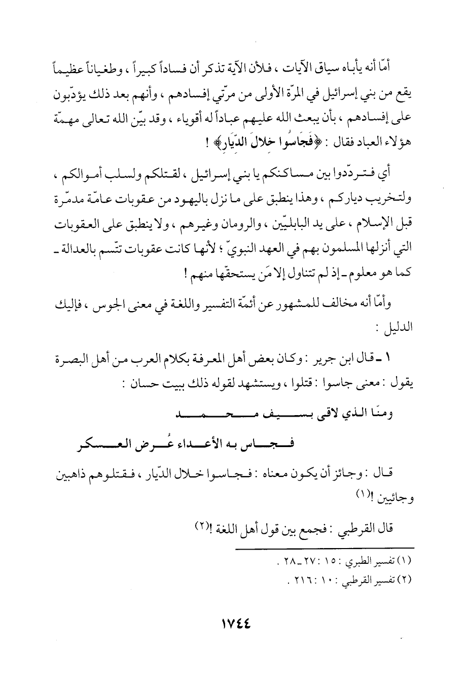 1 - قال ابن جرير: وكان بعض أهل المعرفة بكلام العرب من أهل البصرة يقول: معنى جاسوا: قتلوا، ويستشهد لقوله ذلك ببيت حسان: