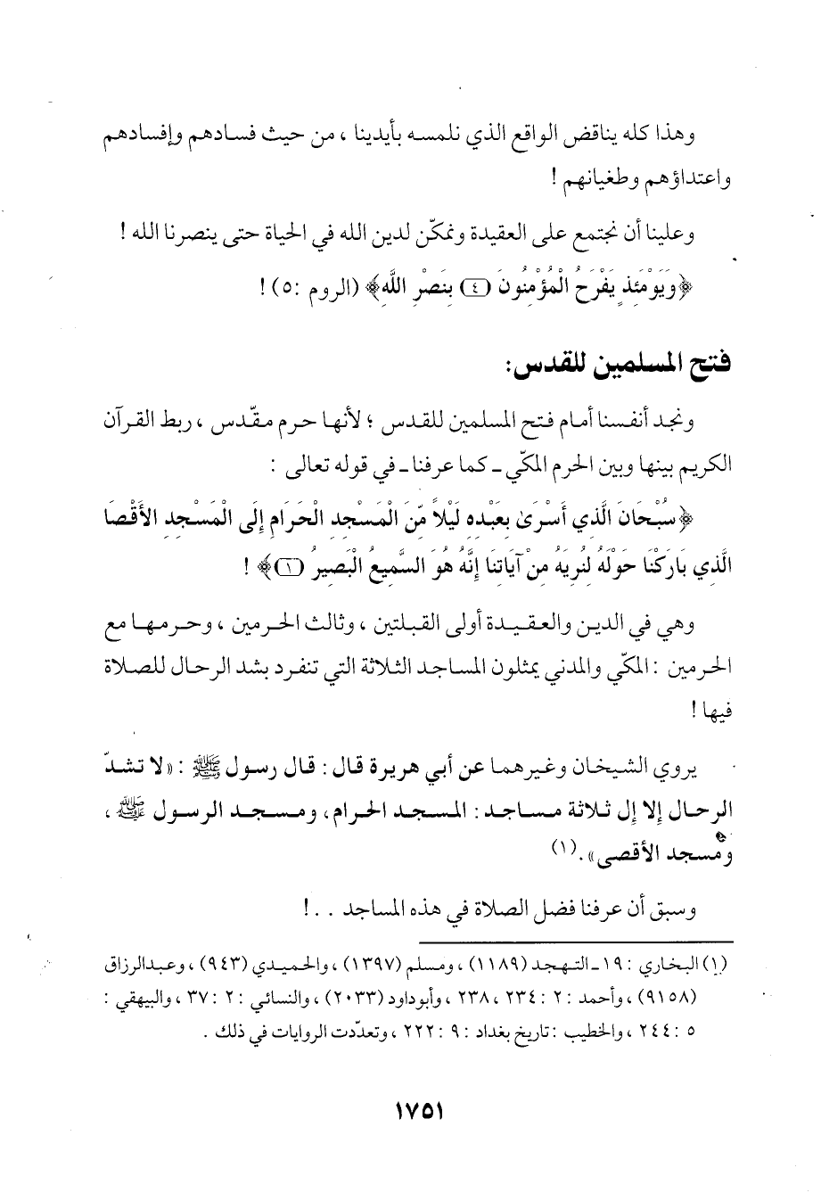 يروي الشيخان وغيرهما عن أبي هريرة قال: قال رسول - صلى الله عليه وسلم -: "لا تشدّ الرحال إِلا إِلى ثلاثة مساجد: المسجد الحرام، ومسجد الرسول - صلى الله عليه وسلم -، ومسجد الأقصى". (¬1)