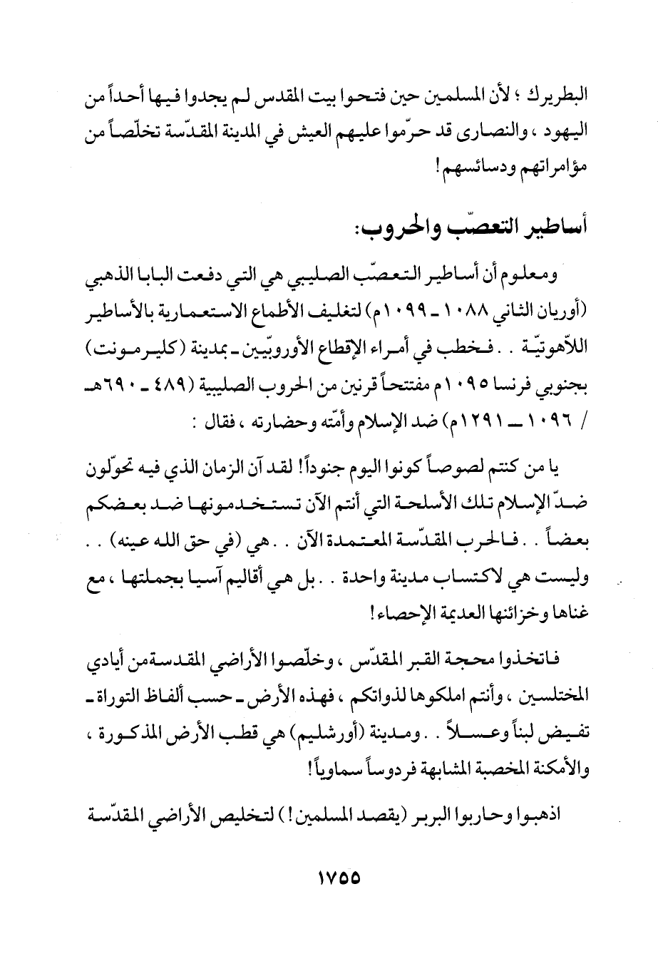 ومعلوم أن أساطير التعصّب الصليبي هي التي دفعت البابا الذهبي (أوريان الثاني 1088 - 1099 م) لتغليف الأطماع الاستعمارية بالأساطير اللاّهوتيّة .. فخطب في أمراء الإقطاع الأوروبّيين - بمدينة (كليرمونت) بجنوبي فرنسا 1095 م مفتتحاً قرنين من الحروب الصليبية (489 - 690 هـ / 1096 - 1291 م) ضد الإِسلام وأمّته وحضارته، فقال: