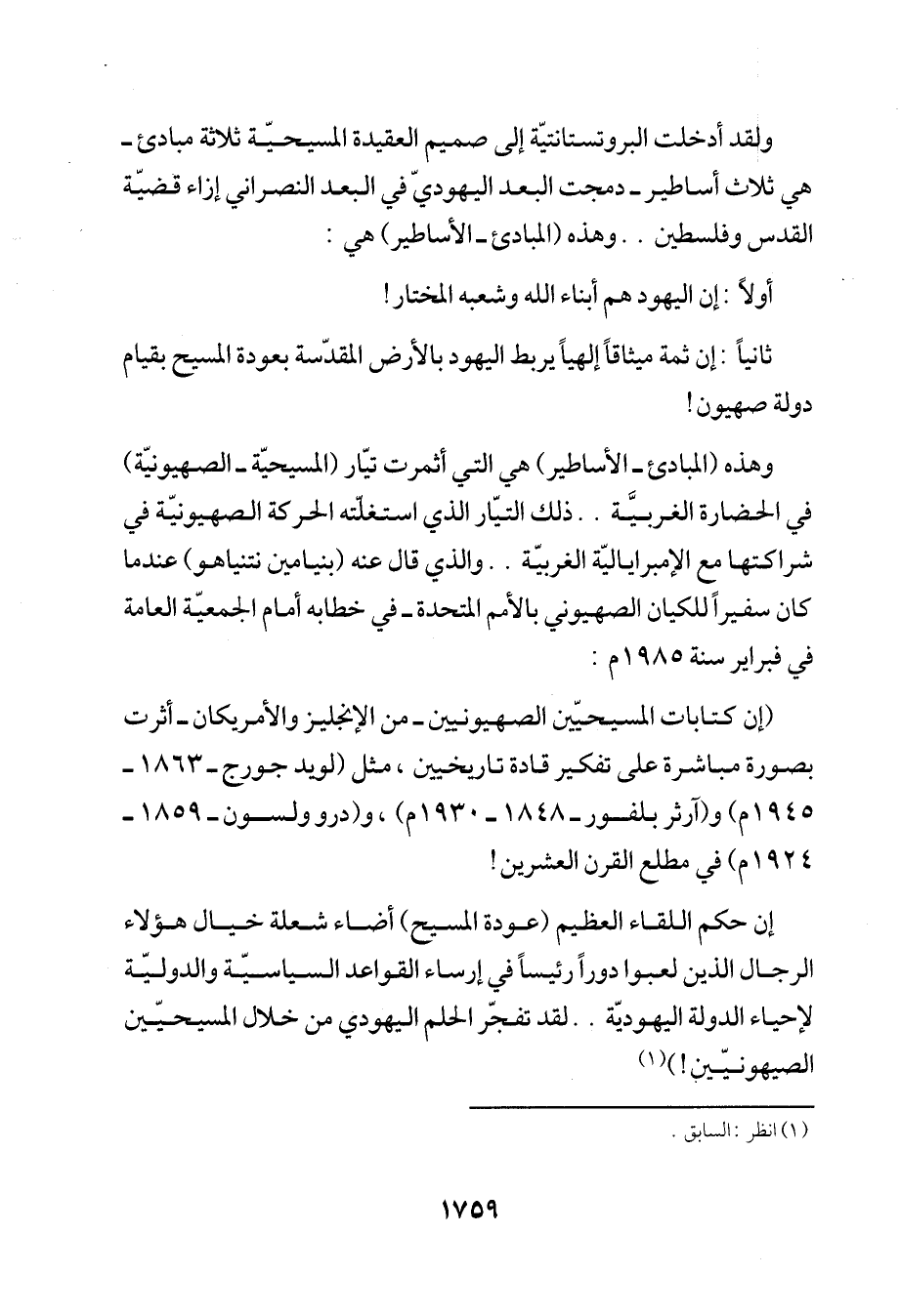 إن حكم اللقاء العظيم (عودة المسيح) أضاء شعلة خيال هؤلاء الرجال الذين لعبوا دوراً رئيساً في إرساء القواعد السياسيّة والدوليّة لإحياء الدولة اليهوديّة .. لقد تفجّر الحلم اليهودي من خلال المسيحيّن الصيهونيّين!) (¬1)