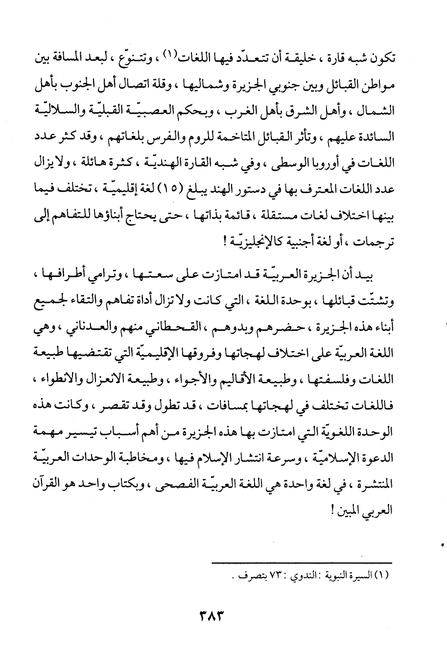 تكون شبه قارة، خليقة أن تتعدّد فيها اللغات (¬1)، وتتنوّع، لبعد المسافة بين مواطن القبائل وبن جنوبي الجزيرة وشماليها، وقلة اتصال أهل الجنوب بأهل الشمال، وأهل الشرق بأهل الغرب، وبحكم العصبيّة القبليّة والسلاليّة السائدة عليهم، وتأثر القبائل المتاخمة للروم والفرس بلغاتهم، وقد كثر عدد اللغات في أوروبا الوسطى، وفي شبه القارة الهنديّة، كثرة هائلة، ولا يزال عدد اللغات المعترف بها في دستور الهند يبلغ (15) لغة إقليميّة، تختلف فيما بينها اختلاف لغات مستقلة، قائمة بذاتها، حتى يحتاج أبناؤها للتفاهم إلى ترجمات، أو لغة أجنبية كالإِنجليزيّة!