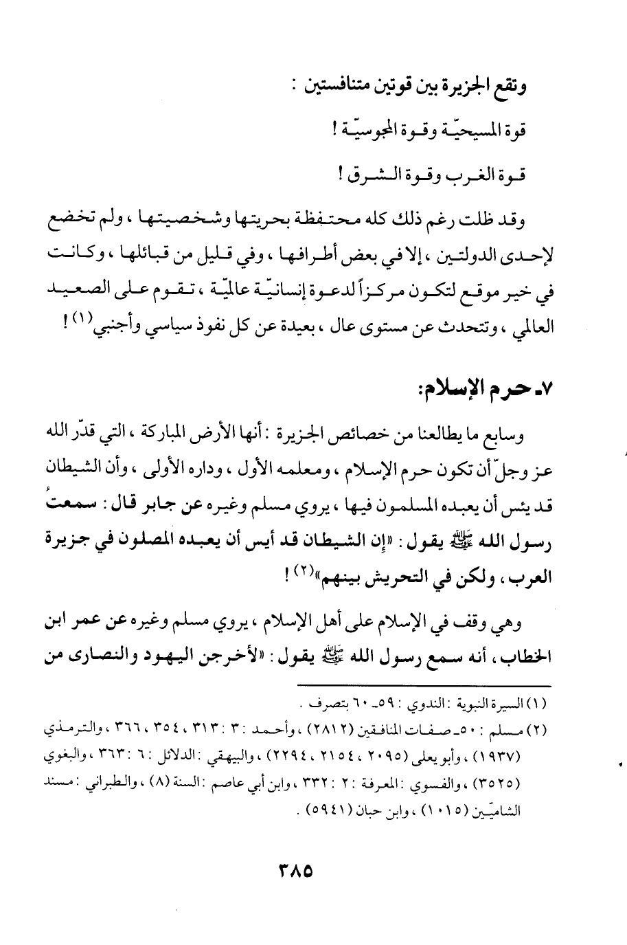 وسابع ما يطالعنا من خصائص الجزيرة: أنها الأرض المباركة، التي قدّر الله عَزَّ وَجَلَّ أن تكون حرم الإسلام، ومعلمه الأول، وداره الأولى، وأن الشيطان قد يئس أن يعبده المسلمون فيها، يروي مسلم وغيره عن جابر قال: سمعت رسول الله - صلى الله عليه وسلم - يقول: "إِن الشيطان قد أيس أن يعبده المصلون في جزيرة العرب، ولكن في التحريش بينهم" (¬2)!