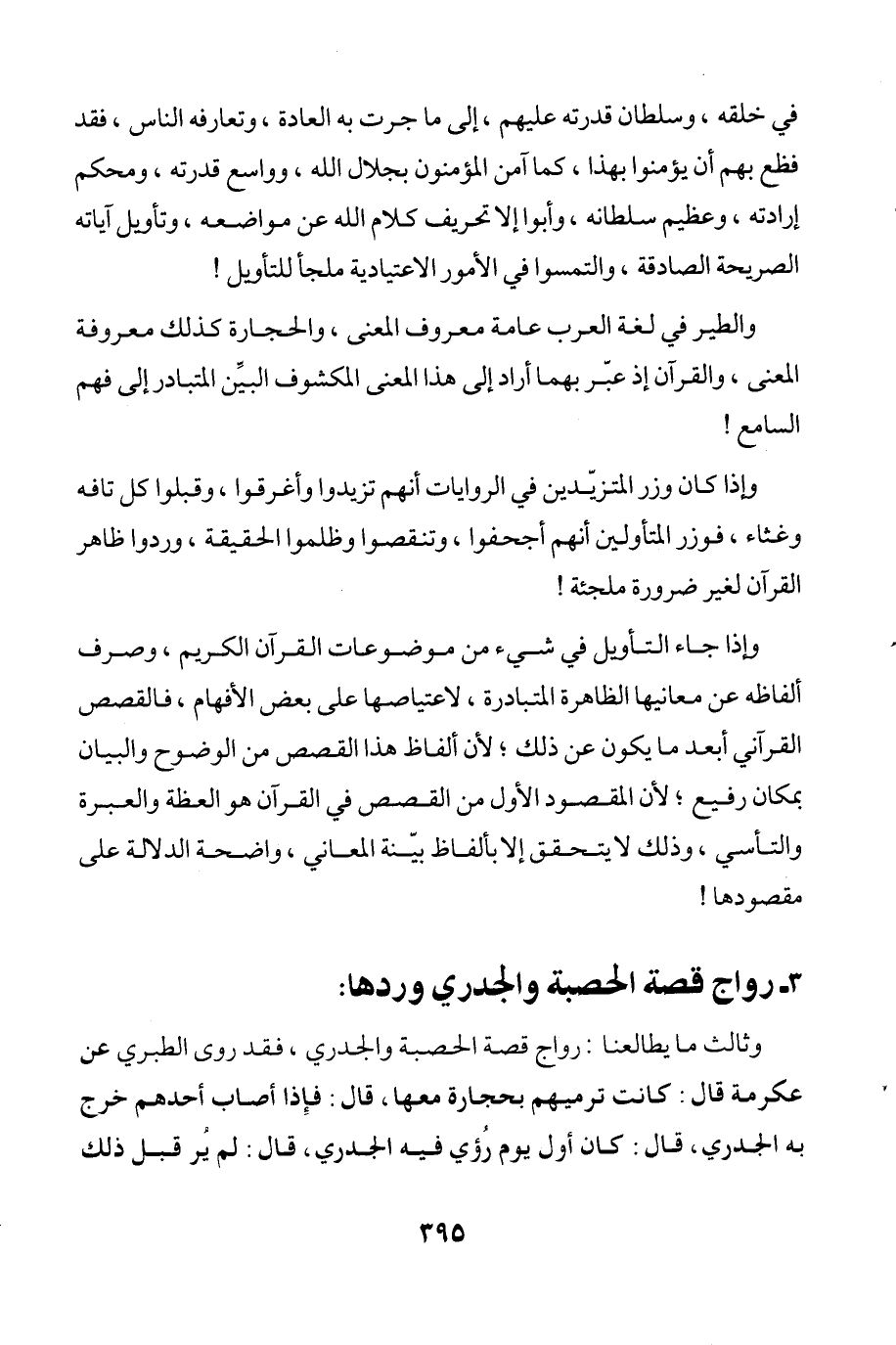 وإذا جاء التأويل في شيء من موضوعات القرآن الكريم، وصرف ألفاظه عن معانيها الظاهرة المتبادرة، لاعتياصها على بعض الأفهام، فالقصص القرآني أبعد ما يكون عن ذلك؛ لأن ألفاظ هذا القصص من الوضوح والبيان بمكان رفيع؛ لأن المقصود الأول من القصص في القرآن هو العظة والعبرة والتأسي، وذلك لا يتحقق إلا بألفاظ بيّنة المعاني، واضحة الدلالة على مقصودها!