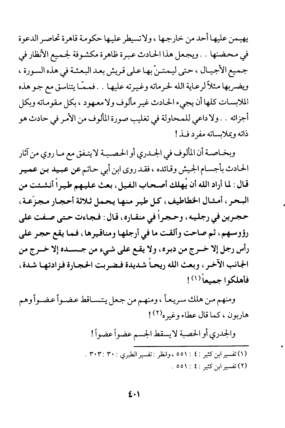 وبخاصة أن المألوف في الجدري أو الحصبة لا يتفق مع ما روي من آثار الحادث بأجسام الجيش وقائده، فقد روى ابن أبي حاتم عن عبيد بن عمير قال: لما أراد الله أن يُهلك أصحاب الفيل، بعث عليهم طيراً أنشئت من البحر، أمثال الخطاطيف، كل طير منها يحمل ثلاثة أحجار مجزّعة، حجرين في رجليه، وحجراً في منقاره، قال: فجاءت حتى صفت على رؤوسهم، ثم صاحت وألقت ما في أرجلها ومناقيرها، فما يقع حجر على رأس رجل إِلا خرج من دبره، ولا يقع على شيء من جسده إِلا خرج من الجانب الآخر، وبعث الله ريحاً شديدة فضربت الحجارة فزادتها شدة، فأهلكوا جميعاً (¬1)!