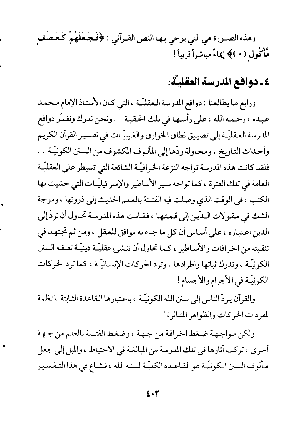 ورابع ما يطالعنا: دوافع المدرسة العقليّة، التي كان الأستاذ الإمام محمد عبده، رحمه الله، على رأسها في تلك الحقبة .. ونحن ندرك ونقدّر دوافع المدرسة العقلية إلى تضييق نطاق الخوارق والغيبيّات في تفسير القرآن الكريم وأحداث التاريخ, ومحاولة ردّها إلى المألوف المكشوف من السنن الكونيّة .. فلقد كانت هذه المدرسة تواجه النزعة الخرافيّة الشائعة التي تسيطر على العقليّة العامة في تلك الفترة، كما تواجه سير الأساطير والإسرائيليّات التي حشيت بها الكتب، في الوقت الذي وصلت فيه الفتنة بالعلم الحديث إلى ذروتها، وموجة الشك في مقولات الدّين إلى قمتها، فقامت هذه المدرسة تحاول أن تردّ إلى الدين اعتباره، على أساس أن كل ما جاء به موافق للعقل، ومن ثم تجتهد في تنقيته من الخرافات والأساطير، كما تحاول أن تنشئ عقليّة دينيّة تفقه السنن الكونيّة، وتدرك ثباتها واطرادها، وترد الحركات الإنسانيّة، كما ترد الحركات الكونيّة في الأجرام والأجسام!