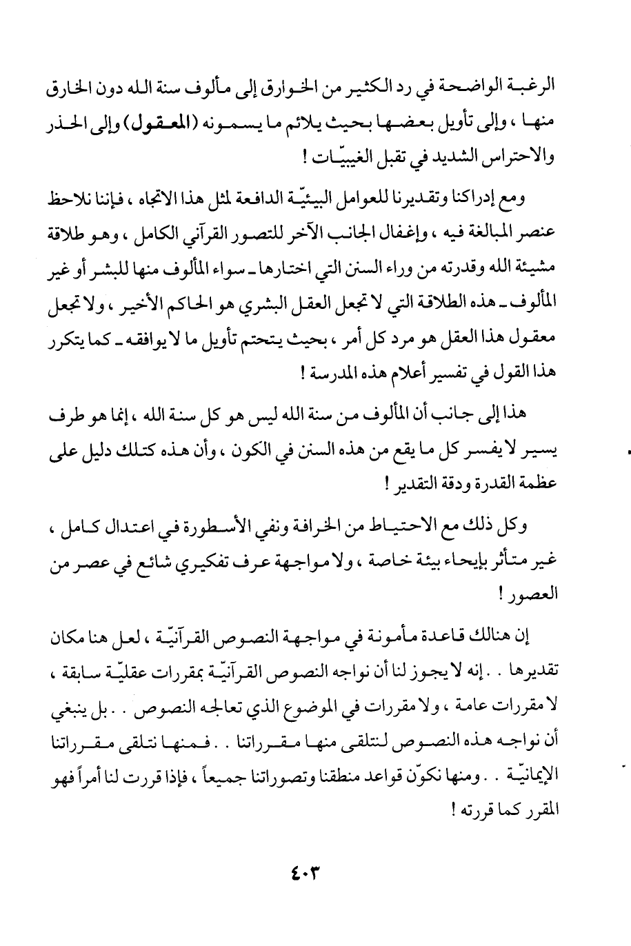 ومع إدراكنا وتقديرنا للعوامل البيئيّة الدافعة لمثل هذا الاتجاه، فإننا نلاحظ عنصر المبالغة فيه، وإغفال الجانب الآخر للتصور القرآني الكامل، وهو طلاقة مشيئة الله وقدرته من وراء السنن التي اختارها -سواء المألوف منها للبشر أو غير المألوف- هذه الطلاقة التي لا تجعل العقل البشري هو الحاكم الأخير، ولا تجعل معقول هذا العقل هو مرد كل أمر، بحيث يتحتم تأويل ما لا يوافقه-كما يتكرر هذا القول في تفسير أعلام هذه المدرسة!