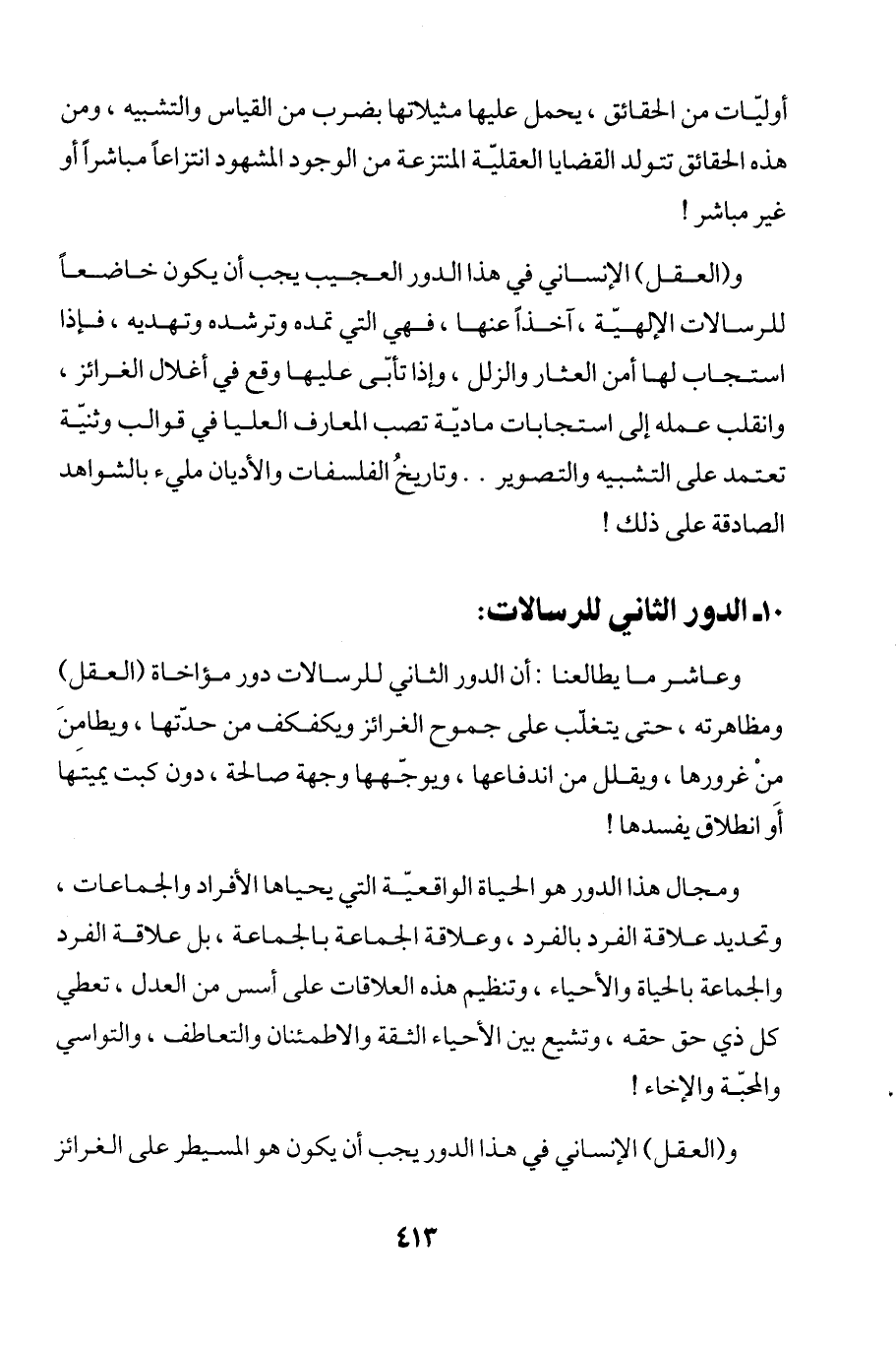 وعاشر ما يطالعنا: أن الدور الثاني للرسالات دور مؤاخاة (العقل) ومظاهرته، حتى يتغلّب على جموح الغرائز ويكفكف من حدّتها، ويطامِنَ مِنْ غرورها، ويقلل من اندفاعها، ويوجّهها وجهة صالحة، دون كبت يميتها أو انطلاق يفسدها!
