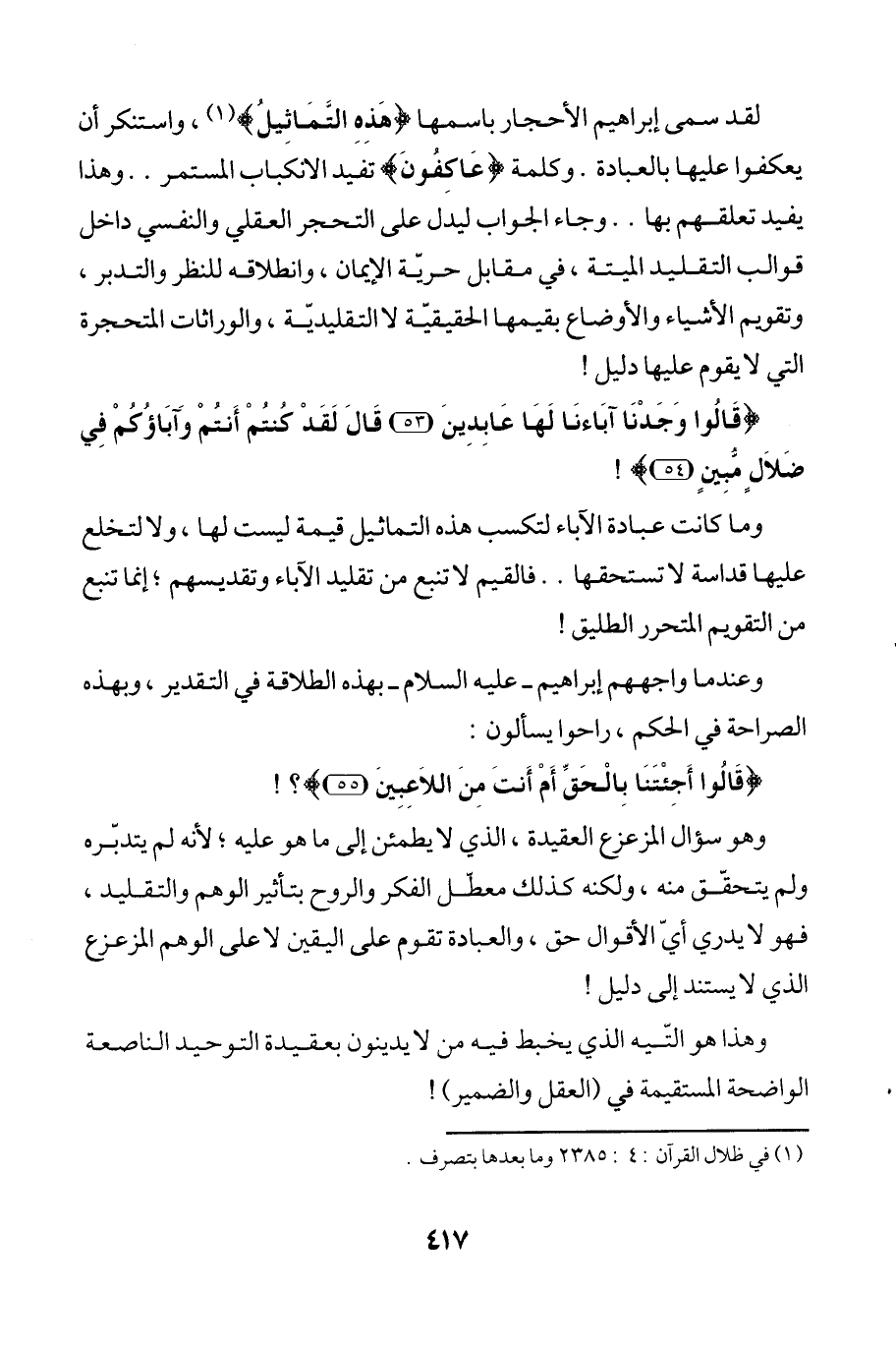 وما كانت عبادة الآباء لتكسب هذه التماثيل قيمة ليست لها, ولا لتخلع عليها قداسة لا تستحقها .. فالقيم لا تنبع من تقليد الآباء وتقديسهم؛ إنما تنبع من التقويم المتحرر الطليق!