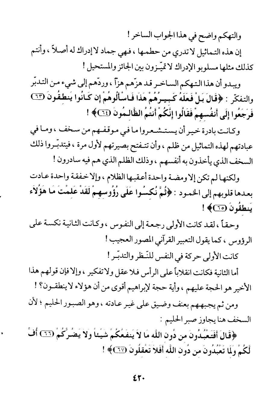 أما الثانية فكانت انقلاباً على الرأس فلا عقل ولا تفكير، وإلا فإن قولهم هذا الأخير هو الحجة عليهم، وأية حجة لإبراهيم أقوى من أن هؤلاء لا ينطقون؟!