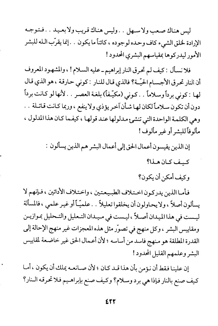 إن علينا فقط أن نؤمن بأن هذا قد كان؛ لأن صانعه يملك أن يكون، أما كيف صنع بالنار فإذا هي برد وسلام؟ وكيف صنع بإبراهيم فلا تحرقه النار؟