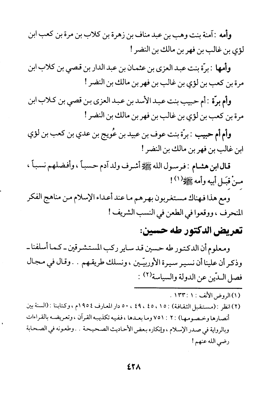 (¬2) انظر: (مستقل الثقافة): 15، 45، 49، 50 دار المعارف 1954 م، وكتابنا: (السنة بين أنصارها وخصومها): 2: 751 وما بعدها، ففيه تكذيبه القرآن، وتعريضه بالقراءات وبالرواية في صدر الإسلام، وإنكاره بعض الأحاديث الصحيحة .. وطعونه في الصحابة رضي الله عنهم!